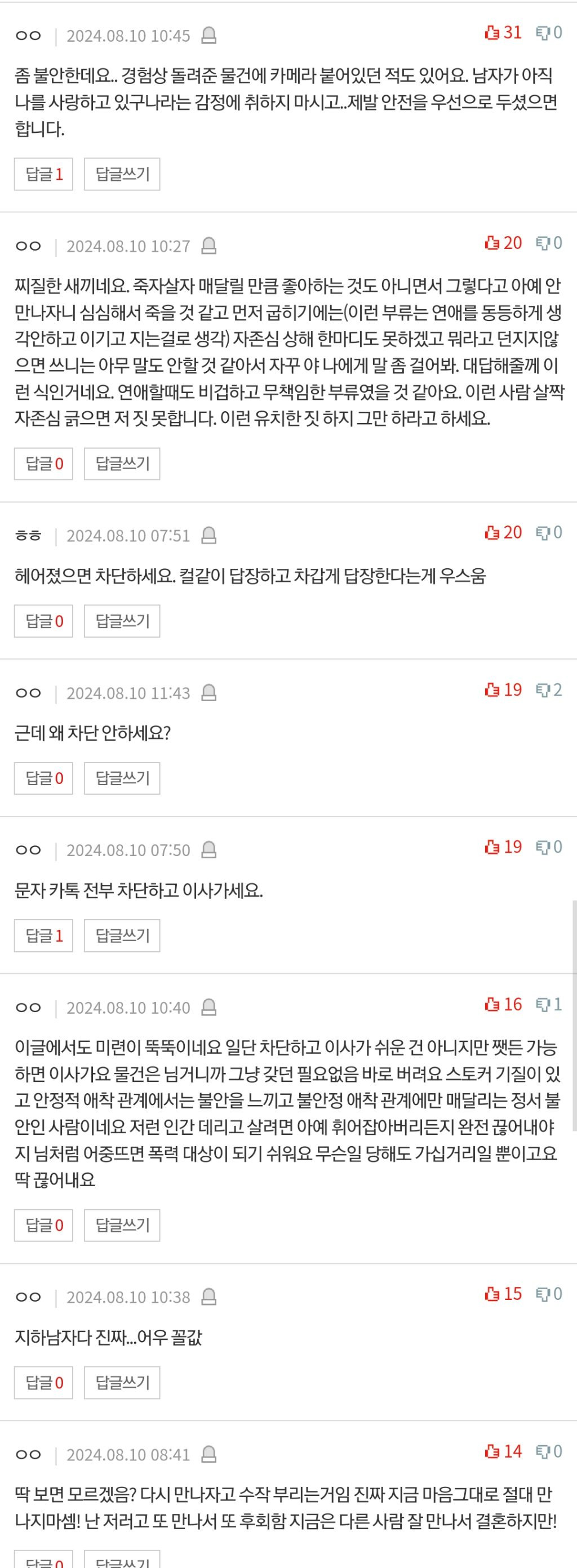 더이상 물건 두고가지말고 근처에도 오지마라고 카톡했고, 답장오는거에 신경쓰고싶지않아서 번호 카톡 다 차단했습니다. 이사도 제가 곧 계약기간이 끝나서 무조건 옮길게요 ㅠㅠ 많은분들의 걱정덕분에 정신을 좀 차린것같아요. 미련있는건 절대아닌데 그렇게보였다면 죄송해요. 어떤형식이든 제가 연락하는게 너무싫어서 무시했던건데 , 가만히있으면 안되는거였군요 ㅠㅠ 조심 또 조심하겠습니다! 감사합니다. 좋은 주말 보내세요