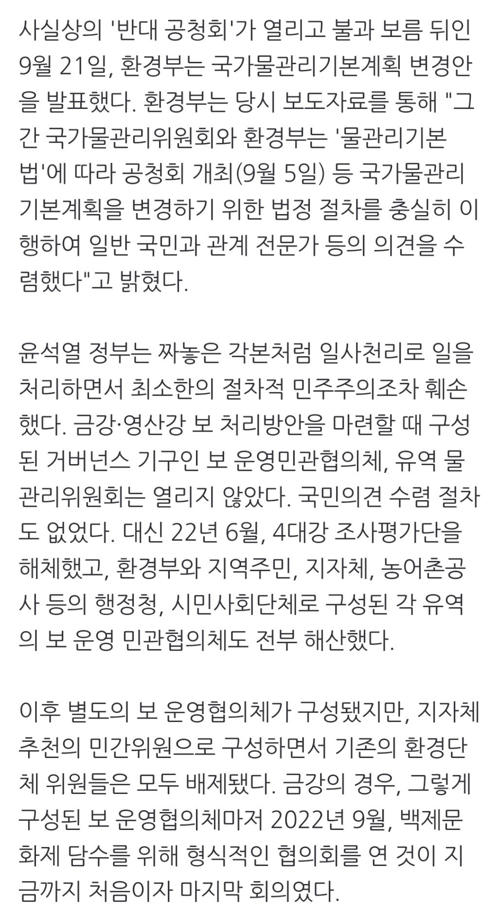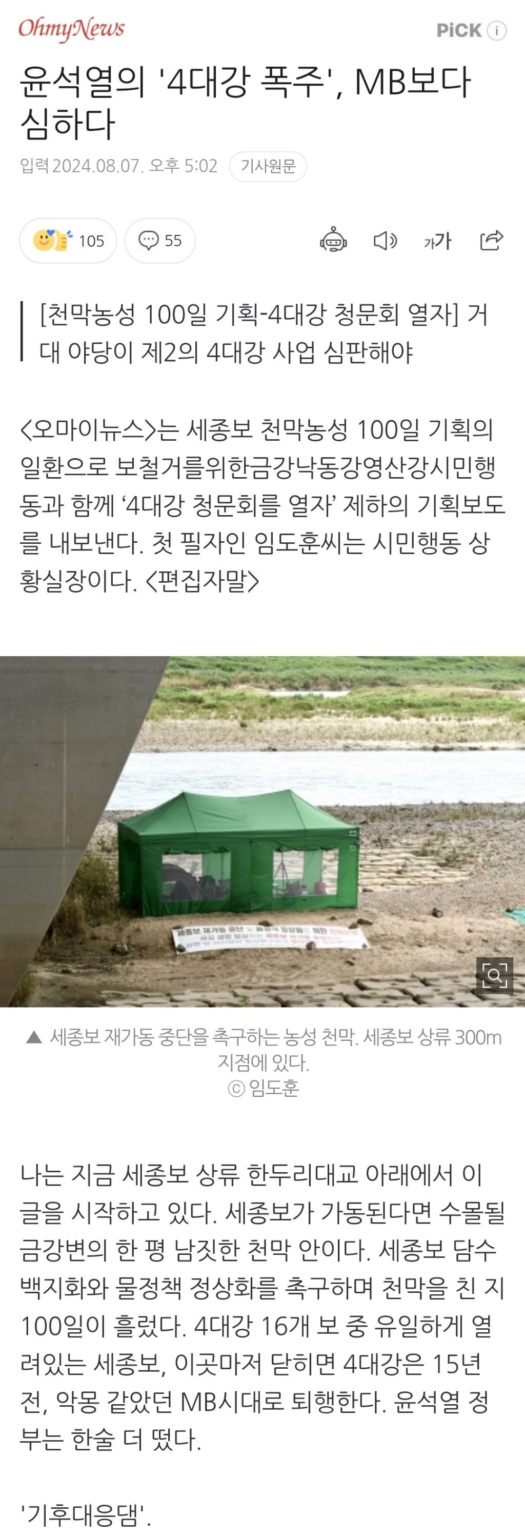 [스크랩] [여시뉴스데스크]윤석열의 '4대강 폭주', MB보다 심하다 작성자천리길|작성시간24.08.11|조회수992 목록 댓글 3 글자크기 작게가 글자크기 크게가 출처: https://naver.me/FqWS95ac윤석열의 '4대강 폭주', MB보다 심하다는 세종보 천막농성 100일 기획의 일환으로 보철거를위한금강낙동강영산강시민행동과 함께 ‘4대강 청문회를 열자’ 제하의 기획보도를 내보낸다. 첫 필자인 임도훈씨는 시민행동 상황실장이n.news.naver.com중략이하 생략전문 출처로 다음검색 스크랩 원문 : *여성시대* 차분한 20대들의 알흠다운 공간 현재 게시글 추가 기능 열기 북마크 공유하기 신고 센터로 신고 댓글 댓글 3 댓글쓰기 답글쓰기 댓글 리스트 작성자에어맥스23 | 작성시간 24.08.11 와 나 진짜 여시아녔으면 몰랐어... 이렇게 소리소문없이 해체가 되는거야? 작성자삼식이 | 작성시간 24.08.11 허.. 작성자조용히해박씨 | 작성시간 24.08.11 와안그래도 댐어쩌고한다해서 명박이생각났는데 미친 댓글 전체보기