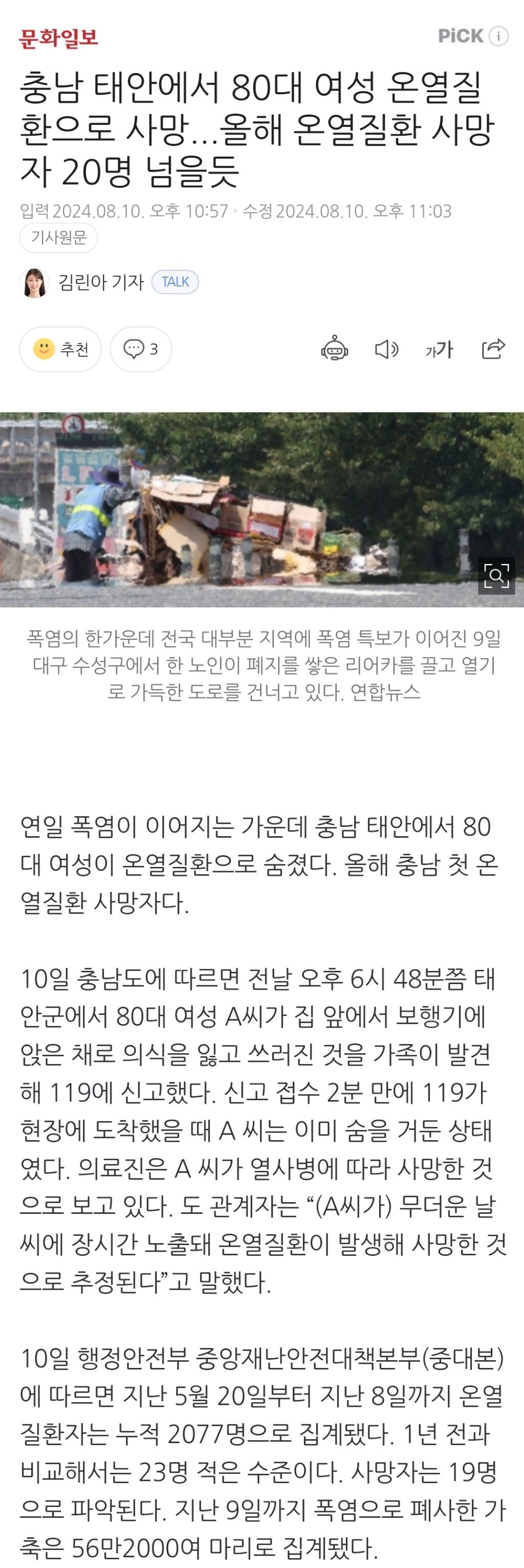 [여시뉴스데스크]충남 태안에서 80대 여성 온열질환으로 사망...올해 온열질환 사망자 20명 넘을듯 작성자천리길|작성시간24.08.11|조회수1,368 목록 댓글 1 글자크기 작게가 글자크기 크게가 출처: https://naver.me/5D8HFaPE충남 태안에서 80대 여성 온열질환으로 사망...올해 온열질환 사망자 20명 넘을듯연일 폭염이 이어지는 가운데 충남 태안에서 80대 여성이 온열질환으로 숨졌다. 올해 충남 첫 온열질환 사망자다. 10일 충남도에 따르면 전날 오후 6시 48분쯤 태안군에서 80대 여성 A씨가 집 앞에n.news.naver.com이하 생략전문 출처로 다음검색 현재 게시글 추가 기능 열기 북마크 공유하기 신고 센터로 신고 댓글 댓글 1 댓글쓰기 답글쓰기 댓글 리스트 작성자뉴욕하와이비치 | 작성시간 24.08.11 그럴만한 더위야.. 모두들 조심하셔요 ㅠ 댓글 전체보기