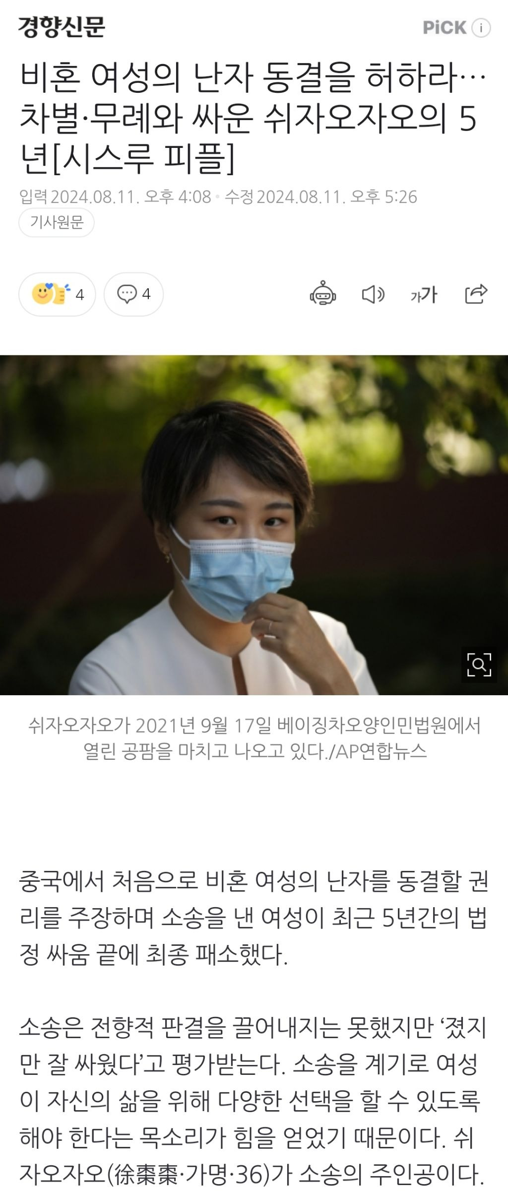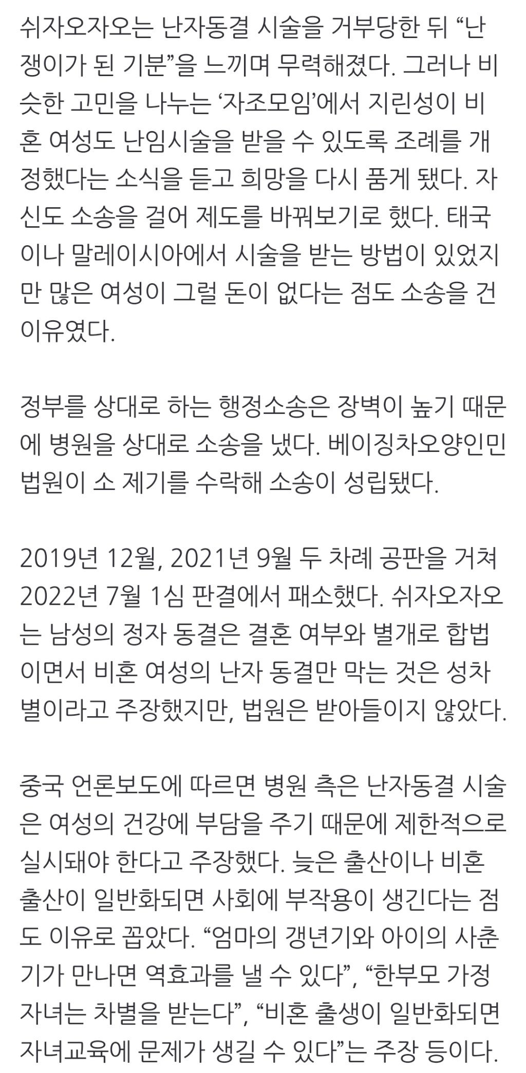 [여시뉴스데스크]비혼 여성의 난자 동결을 허하라…차별·무례와 싸운 쉬자오자오의 5년 작성자천리길|작성시간24.08.11|조회수1,101 목록 댓글 3 글자크기 작게가 글자크기 크게가 출처: https://naver.me/FcmavapO비혼 여성의 난자 동결을 허하라…차별·무례와 싸운 쉬자오자오의 5년[시스루 피플]중국에서 처음으로 비혼 여성의 난자를 동결할 권리를 주장하며 소송을 낸 여성이 최근 5년간의 법정 싸움 끝에 최종 패소했다. 소송은 전향적 판결을 끌어내지는 못했지만 ‘졌지만 잘 싸웠다n.news.naver.com중략이하 생략전문 출처로 다음검색 현재 게시글 추가 기능 열기 북마크 공유하기 신고 센터로 신고 댓글 댓글 3 댓글쓰기 답글쓰기 댓글 리스트 작성자선재갖고튀어 | 작성시간 24.08.11 출산의 주체인 여자조차 존중되지않는 사회시스템에서 출산의 산물인 아이의 인권을 위해서라니 ㅎㅎ 여자갈아서 즈그 유전자 바득바득 남기려는 xy들이 징그러울뿐 작성자펜정 | 작성시간 24.08.12 와 대단한 여성이다.. 그 공권력 강한 중국에서 비혼 여성의 난자동결권으로 소송을 걸다니… 답댓글 작성자펜정 | 작성시간 24.08.12 물론 한번에 얻어낼 수는 없겠지만 ㅠ 저분이 분명 중국사회에 무언가를 깨웠을 거임 댓글 전체보기