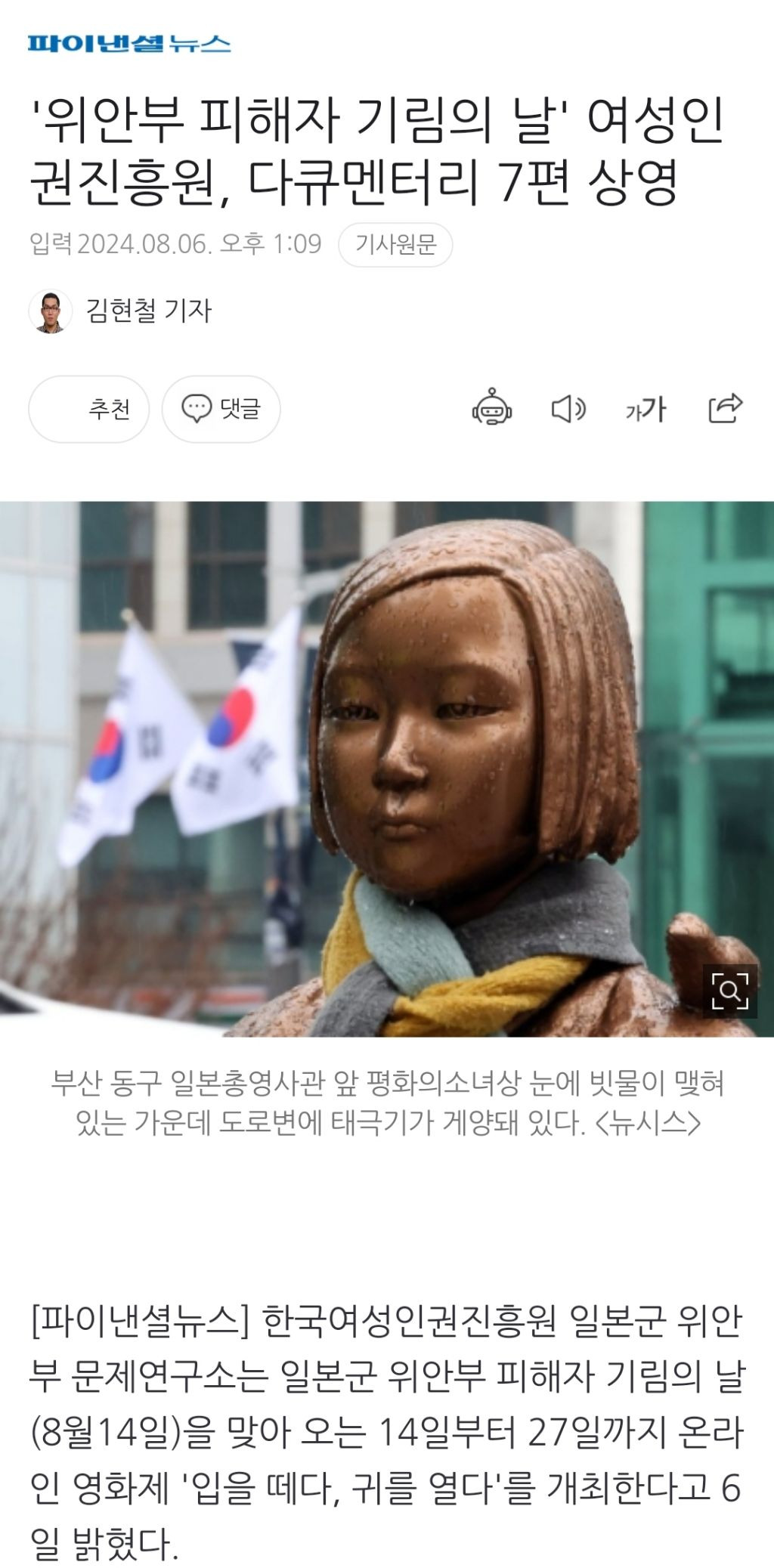 [스크랩] [여시뉴스데스크]'위안부 피해자 기림의 날' 여성인권진흥원, 다큐멘터리 7편 상영 작성자천리길|작성시간24.08.11|조회수337 목록 댓글 2 글자크기 작게가 글자크기 크게가 출처: https://naver.me/F74sdB2K'위안부 피해자 기림의 날' 여성인권진흥원, 다큐멘터리 7편 상영한국여성인권진흥원 일본군 위안부 문제연구소는 일본군 위안부 피해자 기림의 날(8월14일)을 맞아 오는 14일부터 27일까지 온라인 영화제 '입을 떼다, 귀를 열다'를 개최한다고 6일 밝혔다. 진흥n.news.naver.com이하 생략전문 출처로 다음검색 스크랩 원문 : *여성시대* 차분한 20대들의 알흠다운 공간 현재 게시글 추가 기능 열기 북마크 공유하기 신고 센터로 신고 댓글 댓글 2 댓글쓰기 답글쓰기 댓글 리스트 작성자백합미역국 | 작성시간 24.08.11 온라인 상영관 홈페이지에서 무료로 보기가능 작성자좆본 지구상에서 아웃 | 작성시간 24.08.12 오 봐야겠다 고마워! 댓글 전체보기