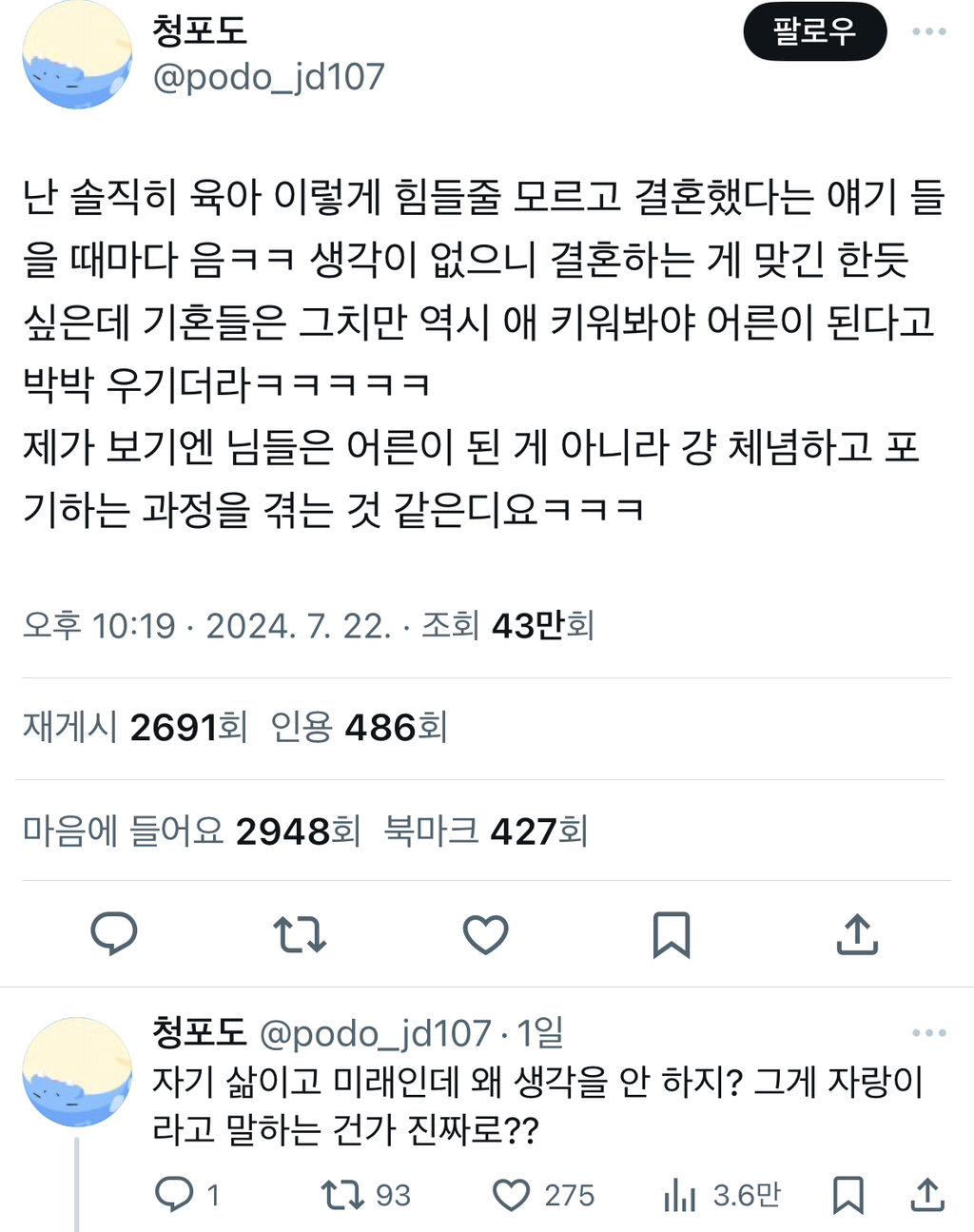 작성자송하영 경위 작성시간 24.08.13 애 안 낳으면 노후는 어떡하게? <- 라는 질문하는 사람 보고 저러니 결혼하는구나 생각함