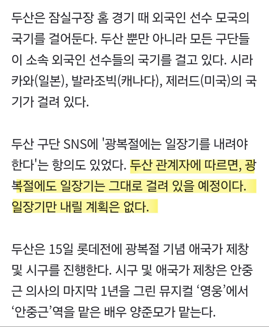 [칵.cxxx]내일 광복절에 일장기가 걸려있을 잠실야구장 작성자1루 2틀|작성시간24.08.14|조회수31,598 목록 댓글 269 글자크기 작게가 글자크기 크게가 출처: 여성시대 1루 2틀https://m.sports.naver.com/kbaseball/article/109/0005136910팬들이 항의했으나 내릴 생각 없다고 함 다음검색 현재 게시글 추가 기능 열기 북마크 공유하기 신고 센터로 신고 댓글 댓글 269 댓글쓰기 답글쓰기 댓글 리스트 작성자꾸짖으면 나온다 | 작성시간 24.08.15 !?? 작성자좋아하는게너무많은헴 | 작성시간 24.08.15 결국 다 내렸다드라 답댓글 작성자날라리맘모야 | 작성시간 24.08.15 걸국 다 내렸대? 그렇다면 다행 ㅠ 답댓글 작성자좋아하는게너무많은헴 | 작성시간 24.08.15 날라리맘모야 쩌리에도 올라왔음!! 작성자공복유산소할거야 | 작성시간 24.08.15 아 나라 잘돌아간다.. 댓글 전체보기