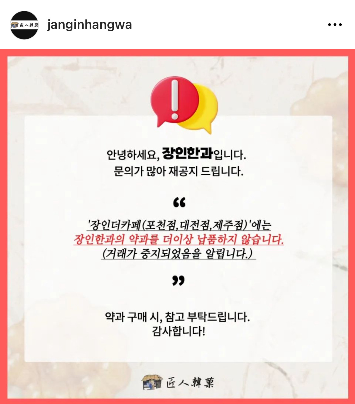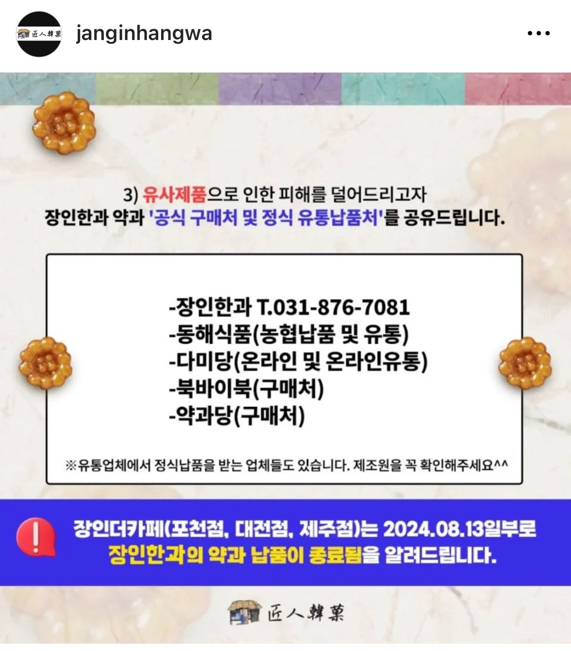 파지약과로 유명해지면서 약과 유행을 불러일으킨 의정부 장인한과에서 이런 공지글이 올라옴