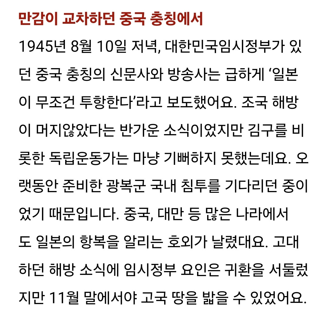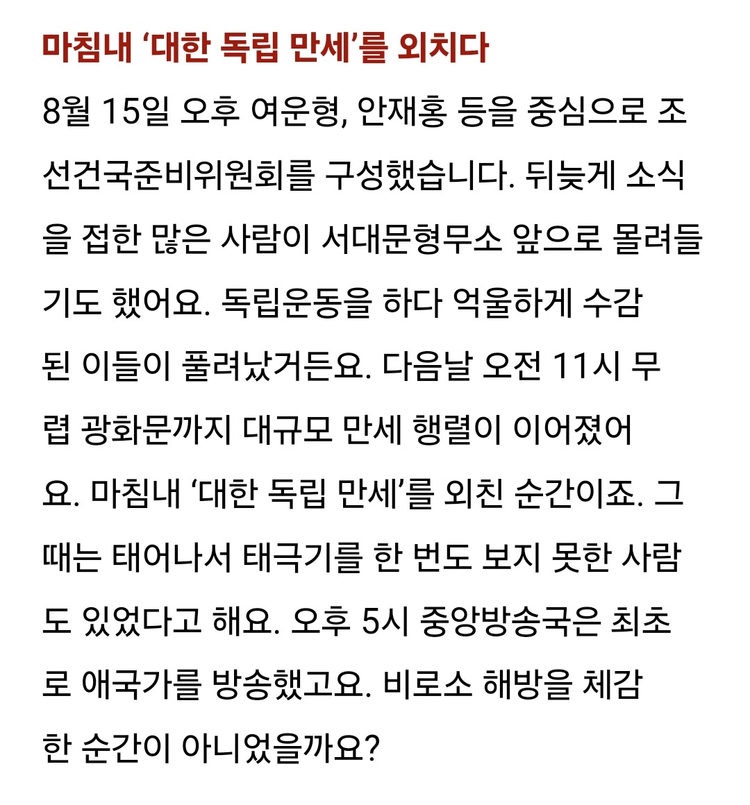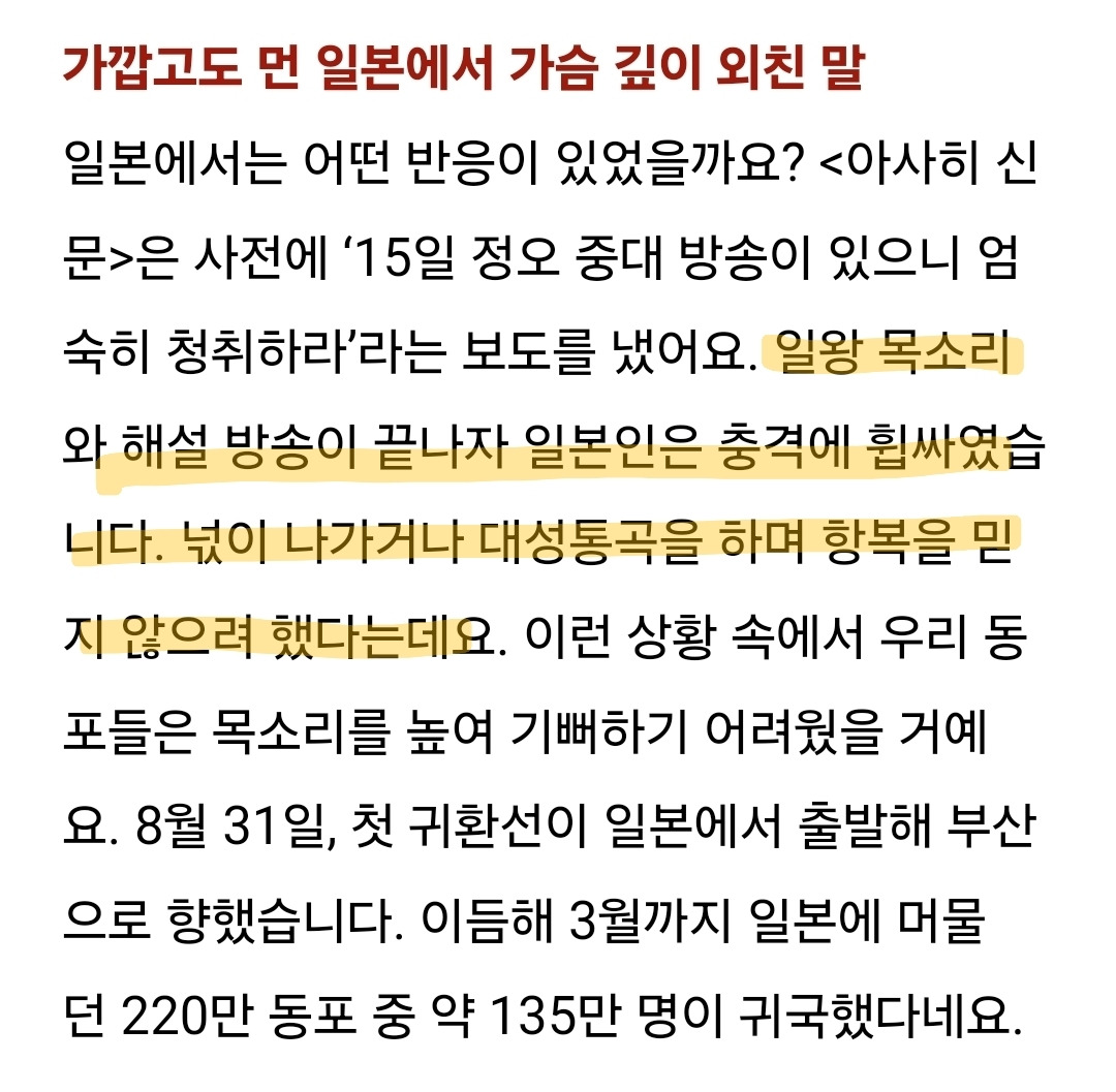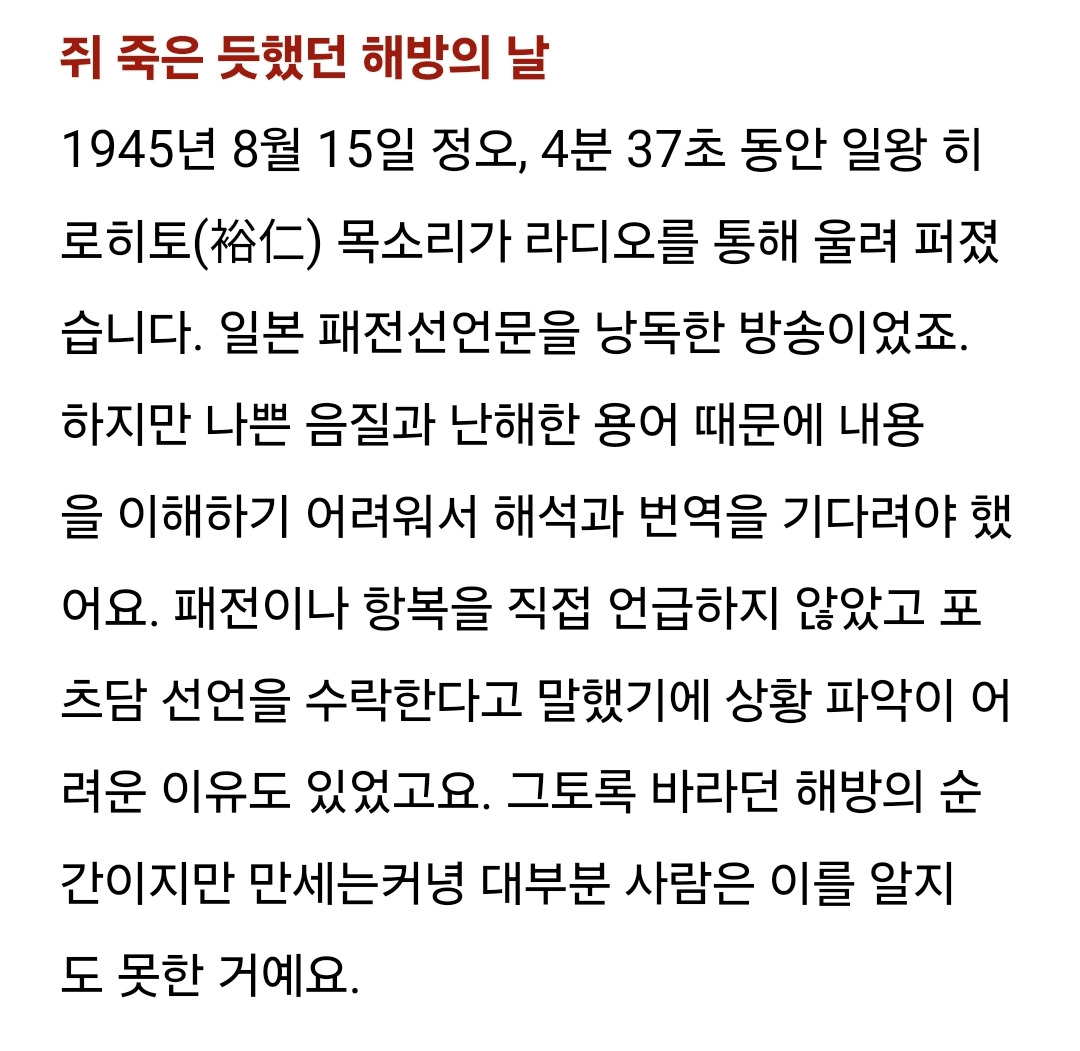 [스크랩] [흥미돋]휴대전화도, TV도 없던 1945년 8월 15일. 어떻게 해방의 자유를 알았을까? 작성자참기름휘휘두른비빔국수|작성시간24.08.15|조회수1,425 목록 댓글 4 글자크기 작게가 글자크기 크게가 출처: https://naver.me/GYCAxwSv휴대전화도, TV도 없던 1945년 8월 15일. 어떻게 해방의 자유를 알았을까?[BY 인투인미디어] 휴대전화도, TV도 없던 1945년 8월 15일 어떻게 해방의 자유를 알았을까?쥐 죽은 ...m.post.naver.com 다음검색 스크랩 원문 : *여성시대* 차분한 20대들의 알흠다운 공간 현재 게시글 추가 기능 열기 북마크 공유하기 신고 센터로 신고 댓글 댓글 4 댓글쓰기 답글쓰기 댓글 리스트 작성자헛웃음 | 작성시간 24.08.15 글 고마워 울긴 니네가 왜 우니 작성자작은고추가싫다 | 작성시간 24.08.15 🇰🇷🇰🇷🇰🇷🇰🇷🇰🇷🇰🇷 작성자이것머예요 | 작성시간 24.08.15 멀 우노 ㅅㅂ 작성자푸르릉 | 작성시간 24.08.15 진짜 얼마나 기뻤을까ㅠㅠ 댓글 전체보기
