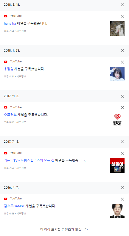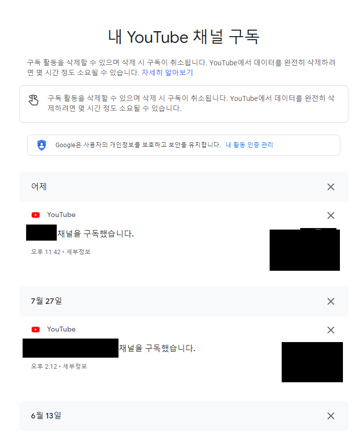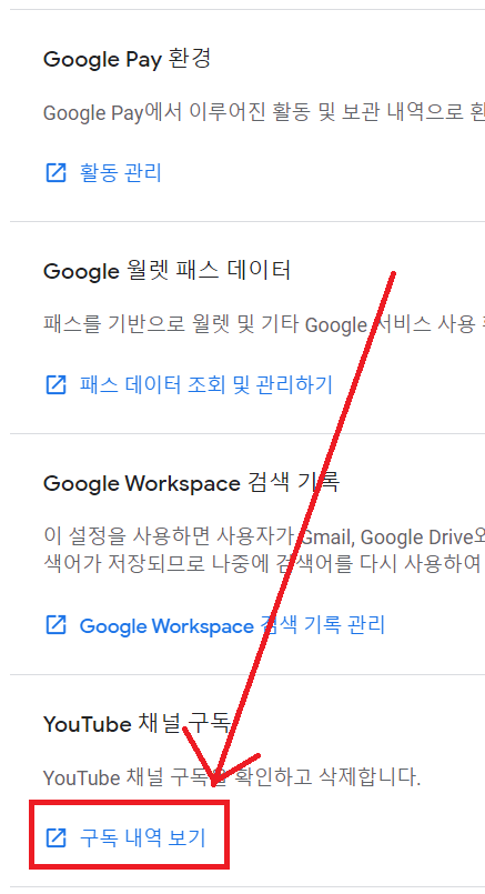4. 아래로 내려서 기타활동의 "youtube 채널구독"아래에 있는 "구독내역보기" 클릭