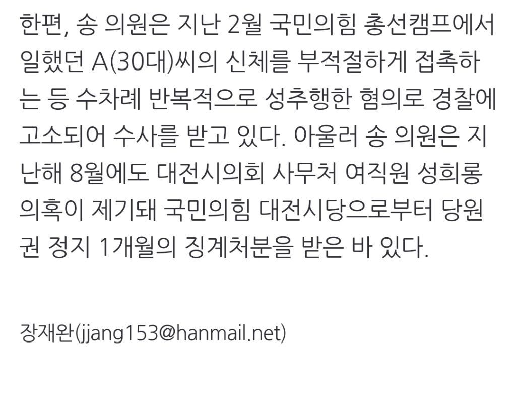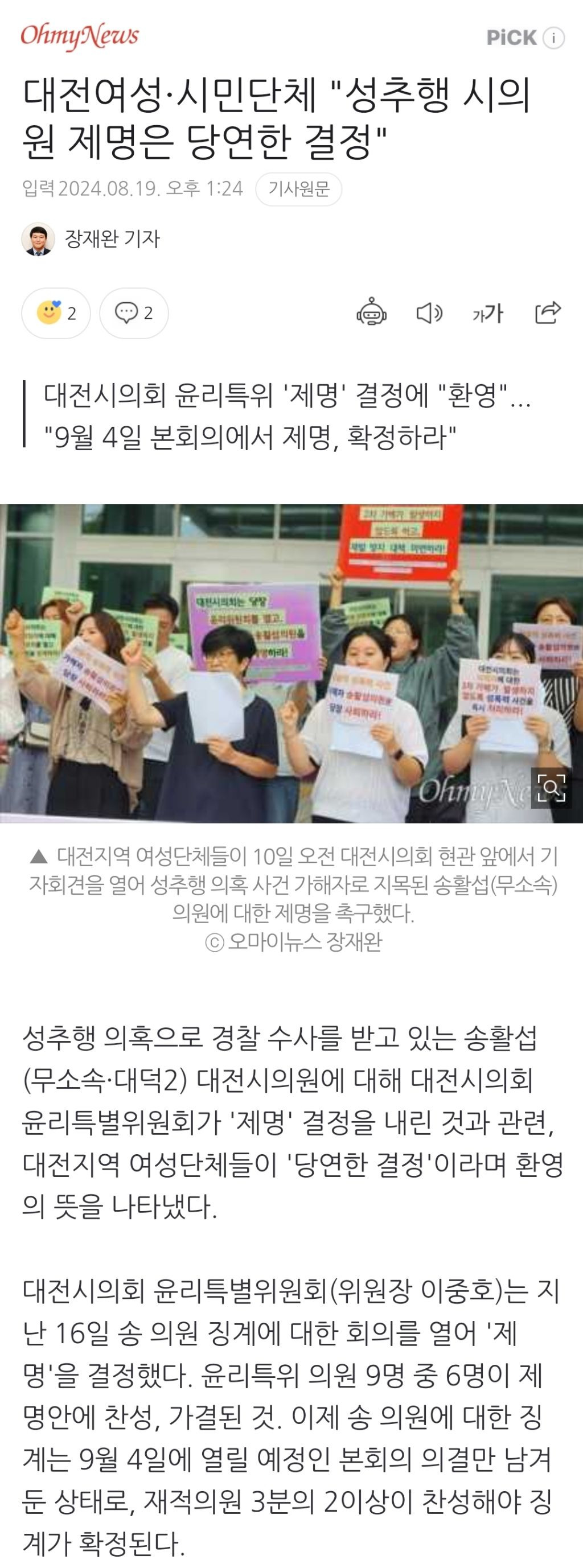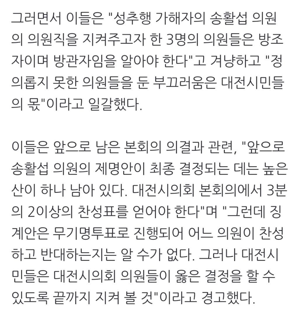 [여시뉴스데스크]대전여성·시민단체 "성추행 시의원 제명은 당연한 결정" 작성자천리길|작성시간24.08.19|조회수385 목록 댓글 0 글자크기 작게가 글자크기 크게가 출처: https://naver.me/FRLr0hnM대전여성·시민단체 "성추행 시의원 제명은 당연한 결정"▲ 대전지역 여성단체들이 10일 오전 대전시의회 현관 앞에서 기자회견을 열어 성추행 의혹 사건 가해자로 지목된 송활섭(무소속) 의원에 대한 제명을 촉구했다. ⓒ 오마이뉴스 장재완 성추행 n.news.naver.com전문 출처로중략중략🔗관련 기사http://m.newspim.com/news/view/20240702001157대전 민주당 여성의원들 "성추행 의혹 시의원 자진사퇴하라"[대전=뉴스핌] 김수진 기자 = 대전시의회 모 남성 의원이 성추행 혐의로 경찰에 고소되자 더불어민주당 소속 여성의원들이 2일 시의회에서 자진 사퇴를 촉구하고 나섰다. 김민숙 대전시의원, 전m.newspim.comhttps://naver.me/GhbsoFPj성추행 혐의 대전시의원 피소…정치권 "사퇴하라"현직 대전시의회 의원이 지난 총선 후보 캠프에서 일하던 여성을 성추행했다는 고소장이 접수된 가운데 정치권에서 시의원의 사퇴를 촉구하는 목소리가 이어지고 있다. 더불어민주당 박정현 n.news.naver.comhttps://naver.me/FbOHh8S8“대전시의원이 성추행“ 30대 여성 경찰에 고소…당사자 "억울하다"국민의힘 소속 대전시의회 의원이 지난 총선 때 캠프에서 일했던 30대 여성을 성추행했다는 의혹이 제기됐다. 피해 여성은 해당 시의원을 최근 경찰에 고소한 것으로 파악됐다. 2일 뉴스1 취재를n.news.naver.comhttps://naver.me/FPnsCYVz대전 여성단체 "성추행 혐의 시의원 징계 처분 솜방망이" 비판대전 지역 여성단체들이 성추행 혐의를 받는 국민의힘 소속 A 대전시의원에 대한 시의회 윤리자문위원회(윤리위)의 징계 처분이 솜방망이 처분이라고 비판하고 나섰다. 대전여성단체연합 등 여n.news.naver.com 다음검색 현재 게시글 추가 기능 열기 북마크 공유하기 신고 센터로 신고 댓글 댓글 0 댓글쓰기 답글쓰기 댓글 리스트