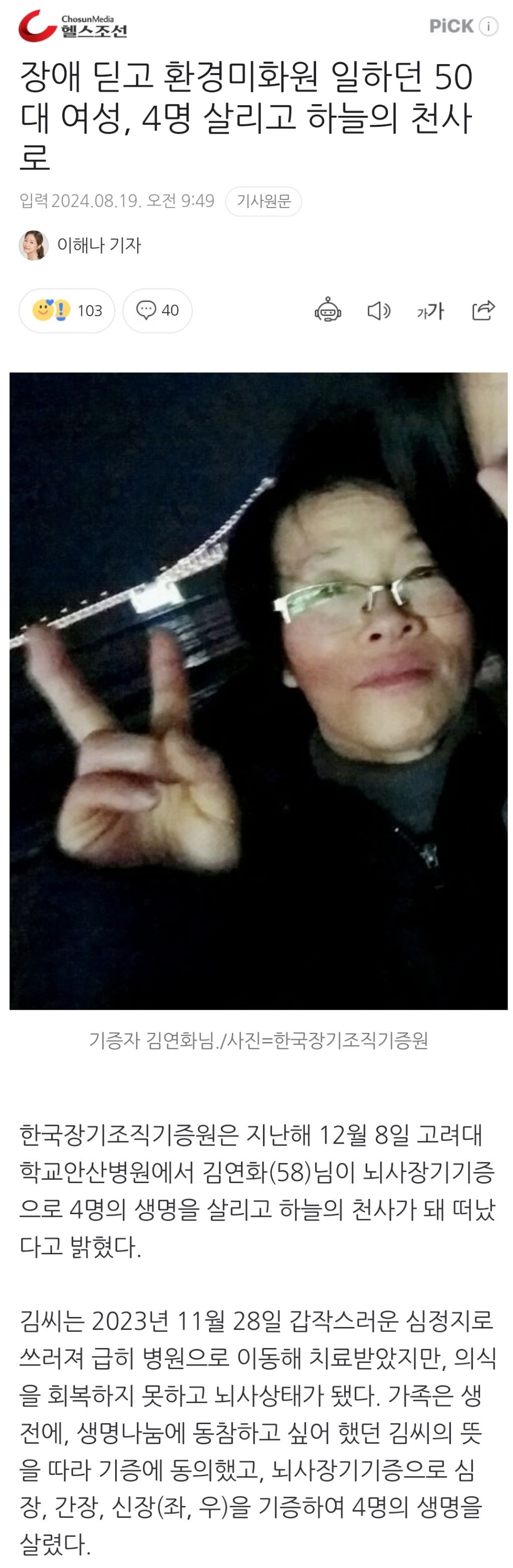 [여시뉴스데스크]장애 딛고 환경미화원 일하던 50대 여성, 4명 살리고 하늘의 천사로 작성자천리길|작성시간24.08.19|조회수2,106 목록 댓글 14 글자크기 작게가 글자크기 크게가 출처: https://naver.me/IxsbQfMh장애 딛고 환경미화원 일하던 50대 여성, 4명 살리고 하늘의 천사로한국장기조직기증원은 지난해 12월 8일 고려대학교안산병원에서 김연화(58)님이 뇌사장기기증으로 4명의 생명을 살리고 하늘의 천사가 돼 떠났다고 밝혔다. 김씨는 2023년 11월 28일 갑작스러운 심n.news.naver.com이하 생략전문 출처로🔗관련 기사https://naver.me/xprY7kxH장애 이겨낸 50대 환경미화원, 4명에게 생명 나누고 하늘로▲ 기증자 김연화 씨 어릴 적 당한 교통사고로 허리가 휜 채로도 환경미화원으로 꿋꿋이 일하며 가정을 꾸려온 50대 여성이 장기를 기증하고 떠나 4명의 생명을 살렸습니다. 한국장기조직기증원n.news.naver.com 다음검색 현재 게시글 추가 기능 열기 북마크 공유하기 신고 센터로 신고 댓글 댓글 14 댓글쓰기 답글쓰기 댓글 리스트 답댓글 작성자코하쿠누시 | 작성시간 24.08.19 덕분에 누군가는 건강해졌을 거예요하늘에선 더더욱 행복하시길 작성자제스프리키위로쉽고즐겁게 | 작성시간 24.08.19 삼가 고인의 명복을 빕니다 작성자자무카 | 작성시간 24.08.19 삼가 고인의 명복을 빕니다 작성자경찰이슬 | 작성시간 24.08.19 삼가 고인의 명복을 빕니다 작성자초록도토리 | 작성시간 24.08.19 삼가 고인의 명복을 빕니다. 댓글 전체보기