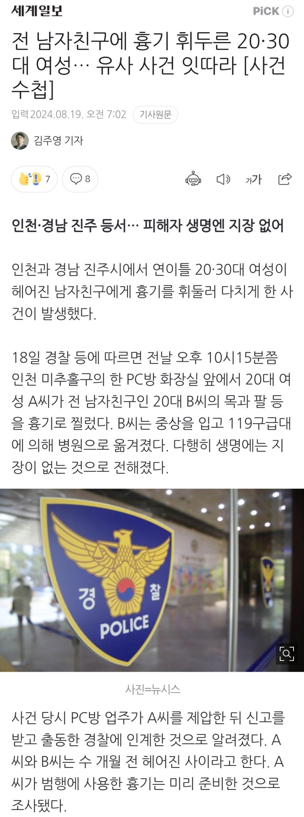 [여시뉴스데스크]전 남자친구에 흉기 휘두른 20·30대 여성… 유사 사건 잇따라 작성자천리길|작성시간24.08.19|조회수2,287 목록 댓글 48 글자크기 작게가 글자크기 크게가 출처: https://naver.me/5bVR22zT전 남자친구에 흉기 휘두른 20·30대 여성… 유사 사건 잇따라 [사건수첩]인천·경남 진주 등서… 피해자 생명엔 지장 없어 인천과 경남 진주시에서 연이틀 20·30대 여성이 헤어진 남자친구에게 흉기를 휘둘러 다치게 한 사건이 발생했다. 18일 경찰 등에 따르면 전날 오n.news.naver.com이하 생략전문 출처로 다음검색 현재 게시글 추가 기능 열기 북마크 공유하기 신고 센터로 신고 댓글 댓글 48 댓글쓰기 답글쓰기 댓글 리스트 작성자잔자라쟌쟌 | 작성시간 24.08.19 그럼 이제 솜방망이 처벌 사라지겠노 작성자투각인면문옹형토기 | 작성시간 24.08.19 어쩌라고 작성자이자벨 마랑 | 작성시간 24.08.19 안죽었음 됐지 작성자민들레씨앗 | 작성시간 24.08.19 응원합니당 작성자일하기싫다뇌요 | 작성시간 24.08.19 흠~ 이유가 있었을듯 중립박는다 댓글 전체보기