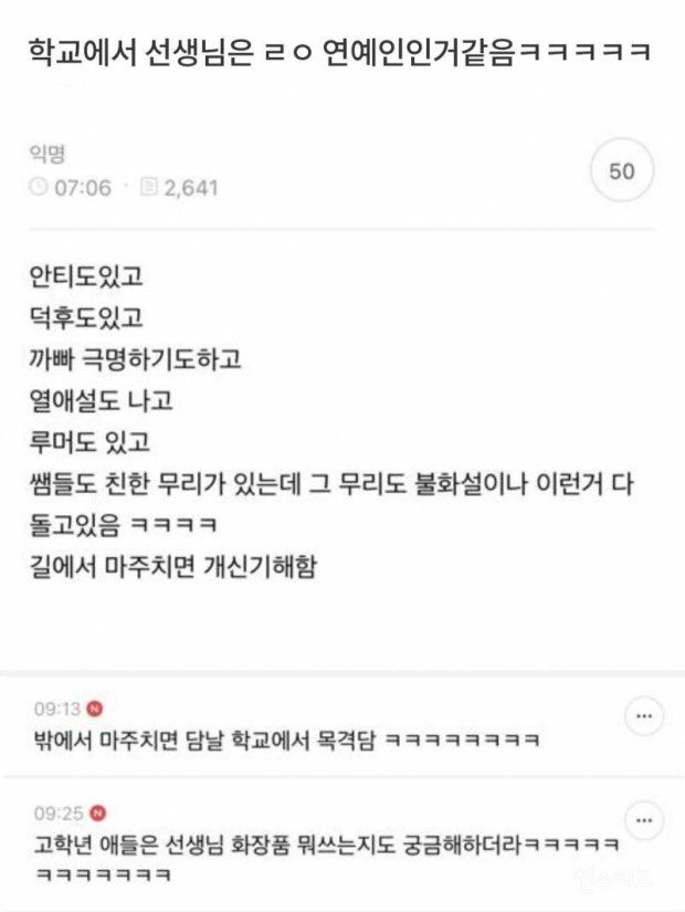 작성자런치타임 작성시간 24.08.19 ㅋㅋ 맞아 웃긴쌤들 평범한 일상썰도 재밌음 걍 라방임