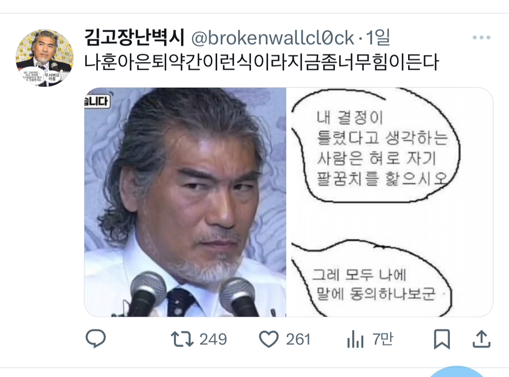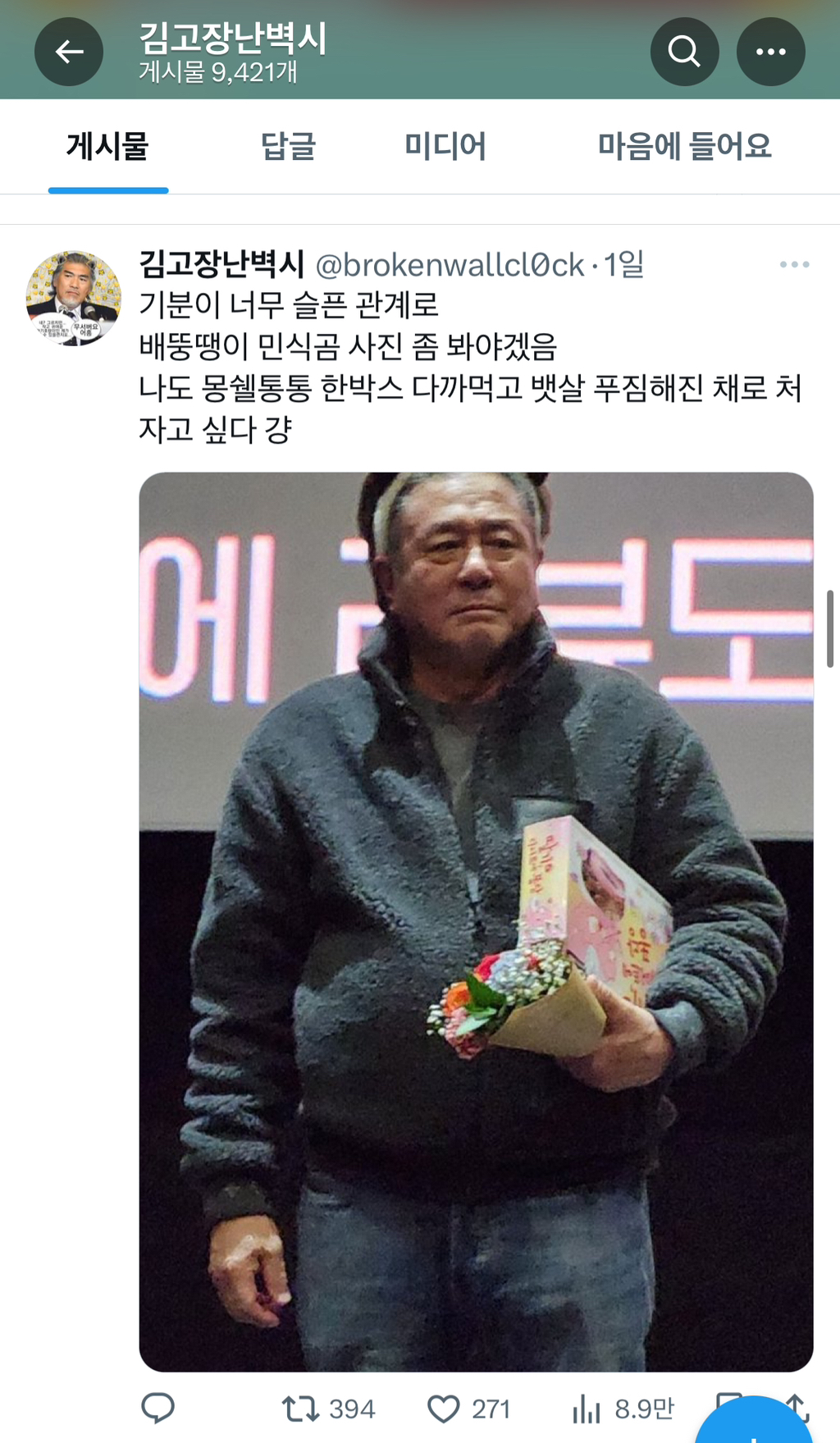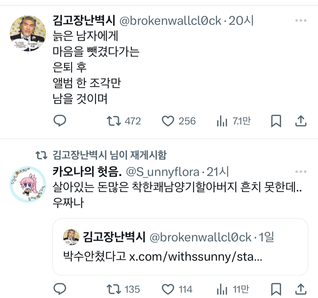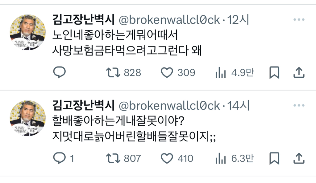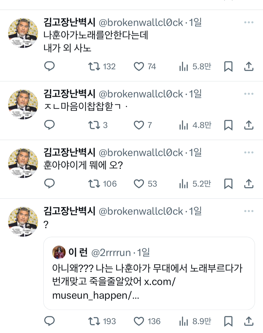 [스크랩] [흥미돋]멘탈 터진 나훈아팬 ㅈㄴ 웃겨 진짜롴ㅋㅋㅋㅋㅋㅋㅋㅠㅠㅠㅠㅠㅠ 작성자나왔네 형|작성시간24.08.20|조회수7,599 목록 댓글 31 글자크기 작게가 글자크기 크게가 원래 좀 두툼한 할배 덕질하는가본데최애 은퇴선언 때매 멘탈 터짐..ㅜ ㅋㅋㅋㅋㅋㅋㅋ홍기 = 훈아헴 본명 다음검색 스크랩 원문 : *여성시대* 차분한 20대들의 알흠다운 공간 현재 게시글 추가 기능 열기 북마크 공유하기 신고 센터로 신고 댓글 댓글 31 댓글쓰기 답글쓰기 댓글 리스트 작성자푸루루루푸푸룬 | 작성시간 24.08.20 살아있고 돈많은 착한쾌남양기할아버지 ㅋㅋㅋㅋㅋㅋㅋㅋㅋ 살아있는게 귀하지.. 작성자Pinnacle | 작성시간 24.08.20 진짜개웃심아 ㅠㅠㅍ 작성자소라게빵 | 작성시간 24.08.20 훈아야 이것 뭐에요? 작성자bhc핫후 | 작성시간 24.08.21 아니 이거 볼때마다 정독함 개웃겨 ㅋㅋㅋㅋㅋㅋㅋㅋㅋㅋ 작성자쩌리만 봐도 한남혐 풀충전 | 작성시간 24.08.21 볼때마다 ㅈㄴ웃겨ㅋㅋㅋㅋㅋㅋㅋㅋ 댓글 전체보기
