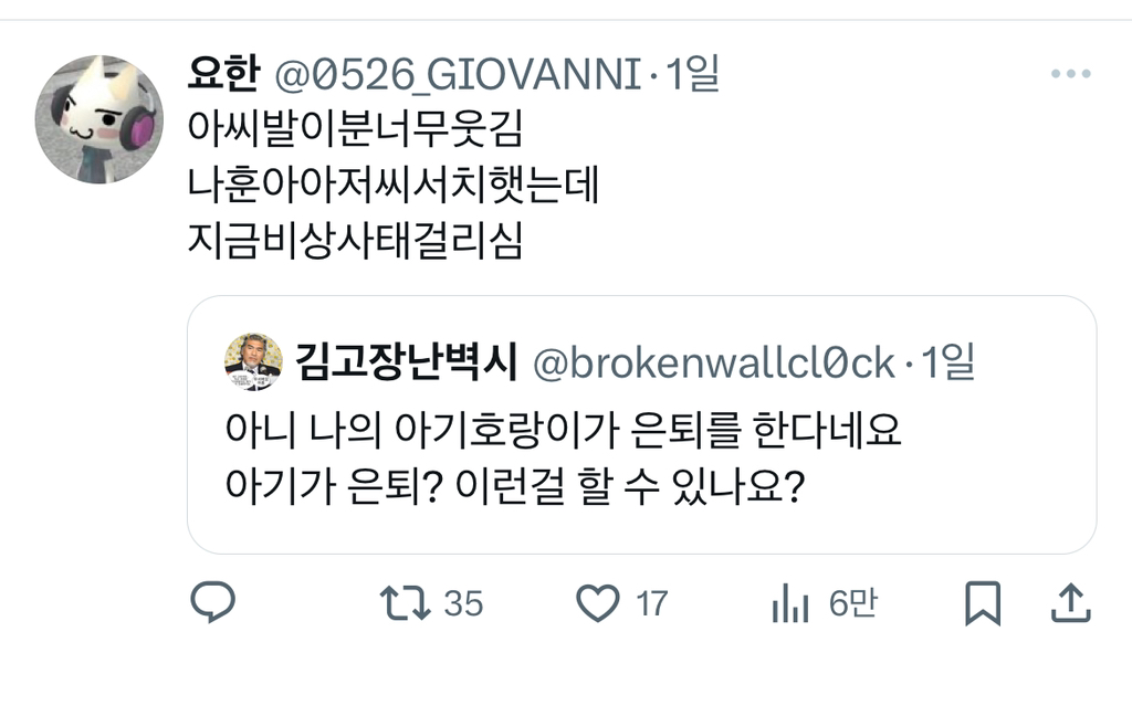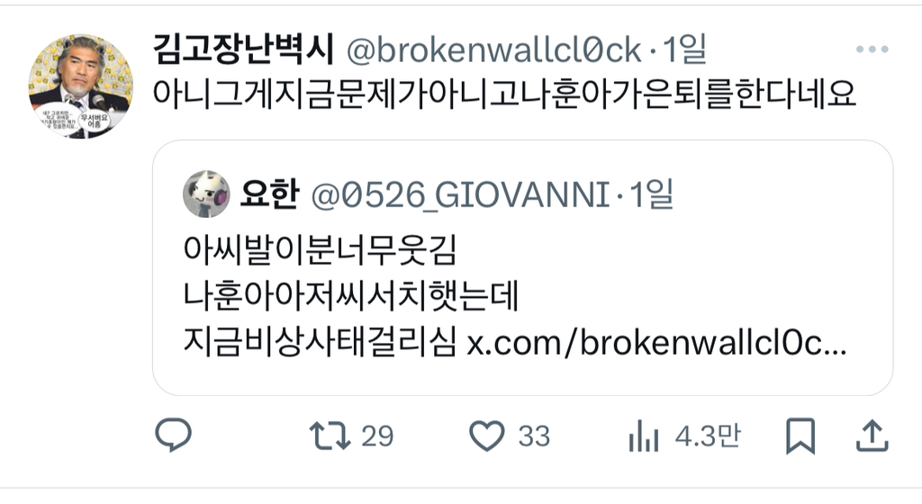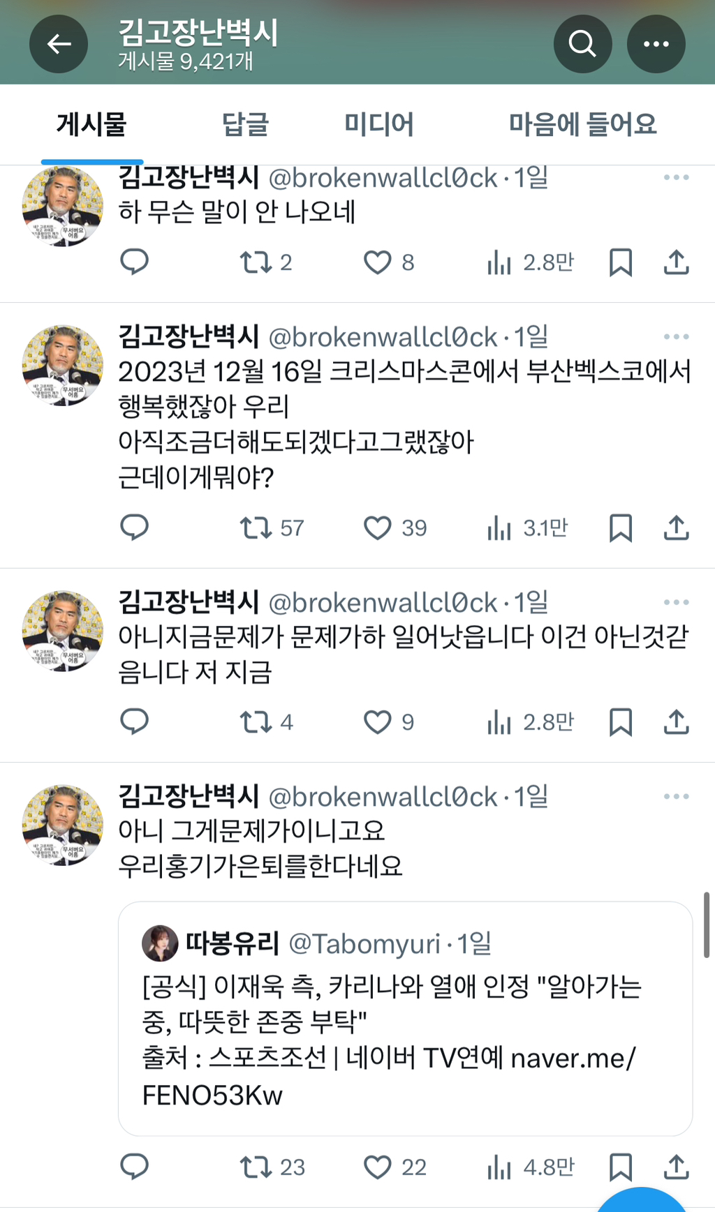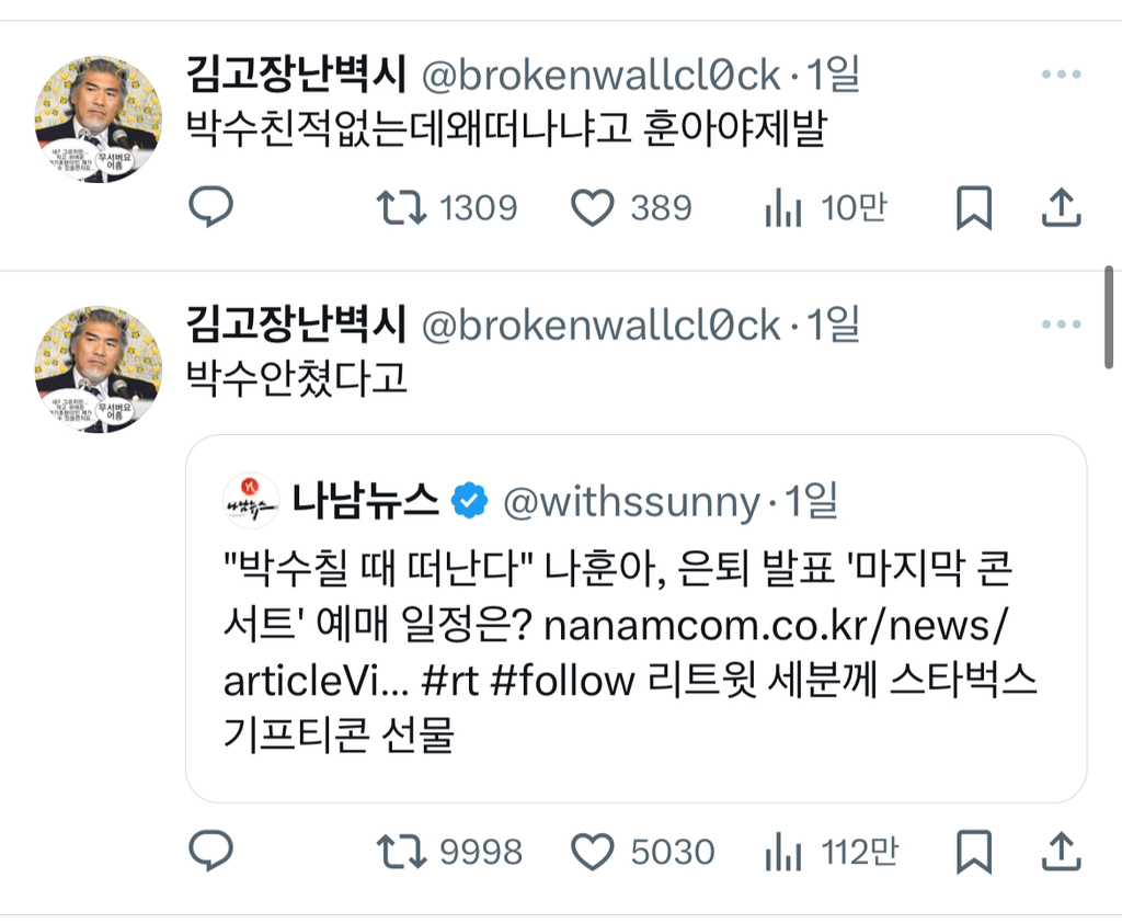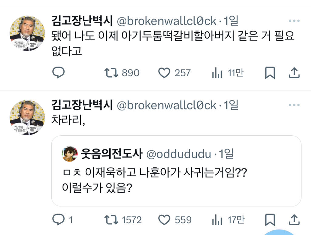 [스크랩] [흥미돋]멘탈 터진 나훈아팬 ㅈㄴ 웃겨 진짜롴ㅋㅋㅋㅋㅋㅋㅋㅠㅠㅠㅠㅠㅠ 작성자나왔네 형|작성시간24.08.20|조회수7,599 목록 댓글 31 글자크기 작게가 글자크기 크게가 원래 좀 두툼한 할배 덕질하는가본데최애 은퇴선언 때매 멘탈 터짐..ㅜ ㅋㅋㅋㅋㅋㅋㅋ홍기 = 훈아헴 본명 다음검색 스크랩 원문 : *여성시대* 차분한 20대들의 알흠다운 공간 현재 게시글 추가 기능 열기 북마크 공유하기 신고 센터로 신고 댓글 댓글 31 댓글쓰기 답글쓰기 댓글 리스트 작성자푸루루루푸푸룬 | 작성시간 24.08.20 살아있고 돈많은 착한쾌남양기할아버지 ㅋㅋㅋㅋㅋㅋㅋㅋㅋ 살아있는게 귀하지.. 작성자Pinnacle | 작성시간 24.08.20 진짜개웃심아 ㅠㅠㅍ 작성자소라게빵 | 작성시간 24.08.20 훈아야 이것 뭐에요? 작성자bhc핫후 | 작성시간 24.08.21 아니 이거 볼때마다 정독함 개웃겨 ㅋㅋㅋㅋㅋㅋㅋㅋㅋㅋ 작성자쩌리만 봐도 한남혐 풀충전 | 작성시간 24.08.21 볼때마다 ㅈㄴ웃겨ㅋㅋㅋㅋㅋㅋㅋㅋ 댓글 전체보기