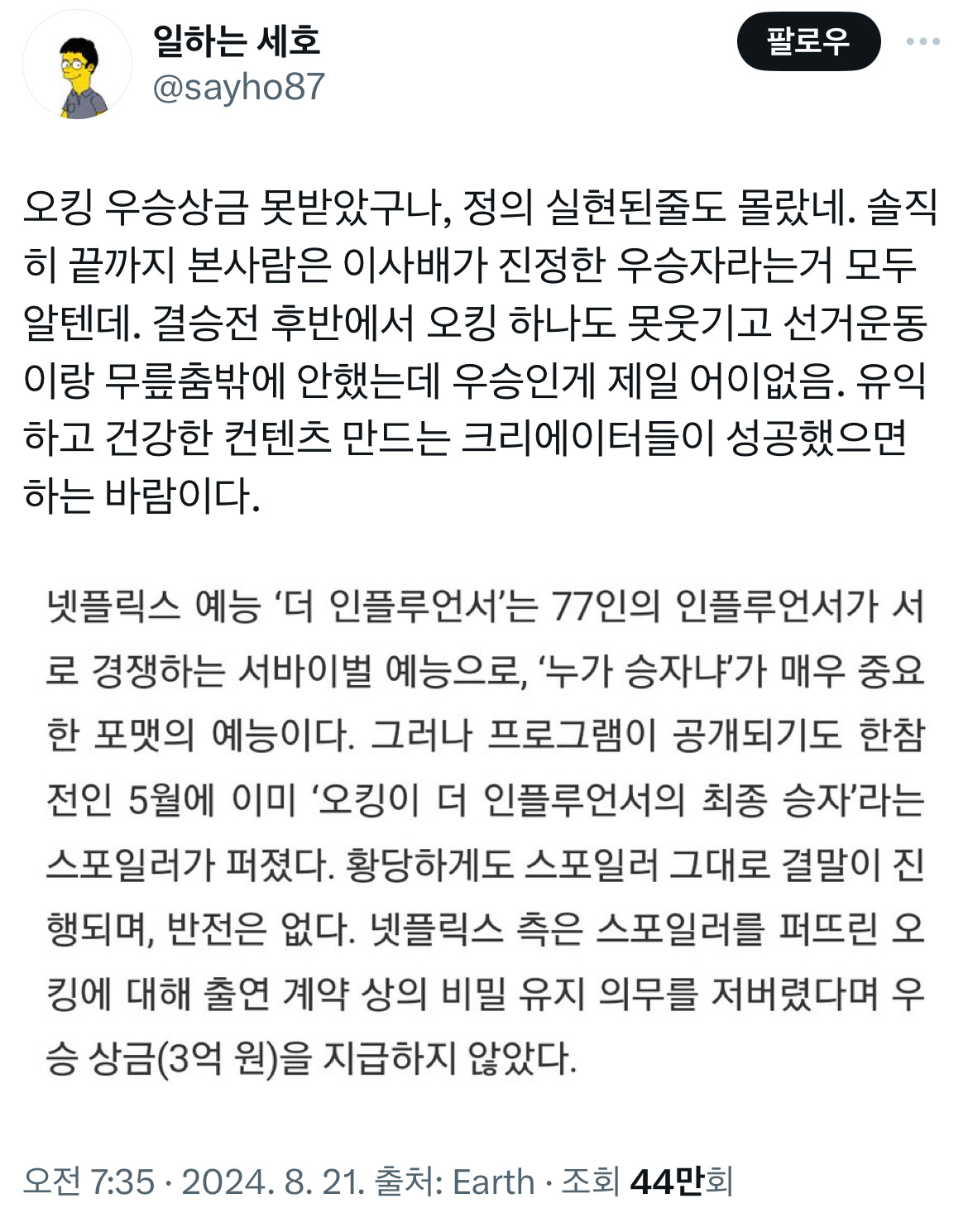 [흥미돋]더인플루언서 우승 상금 못 받은 오킹(ㅋㅋ) 작성자세계여행|작성시간24.08.21|조회수25,508 목록 댓글 78 글자크기 작게가 글자크기 크게가 출처: 여성시대 세계여행https://x.com/sayho87/status/1826025374809206891?s=46&t=3ITLWVxiCSb6uQYMI3f35w 다음검색 현재 게시글 추가 기능 열기 북마크 공유하기 신고 센터로 신고 댓글 댓글 78 댓글쓰기 답글쓰기 댓글 리스트 작성자너무더와요 | 작성시간 24.08.21 사배언니줘 사배언니때문에 전편 정주행했다. 작성자슈봐립뜌 | 작성시간 24.08.21 이사배 줘 작성자토리11,11 | 작성시간 24.08.21 사배줘 작성자참다견디다 | 작성시간 24.08.22 사배즈ㅓ 작성자늑앱 | 작성시간 24.08.22 이사배줘야지 댓글 전체보기