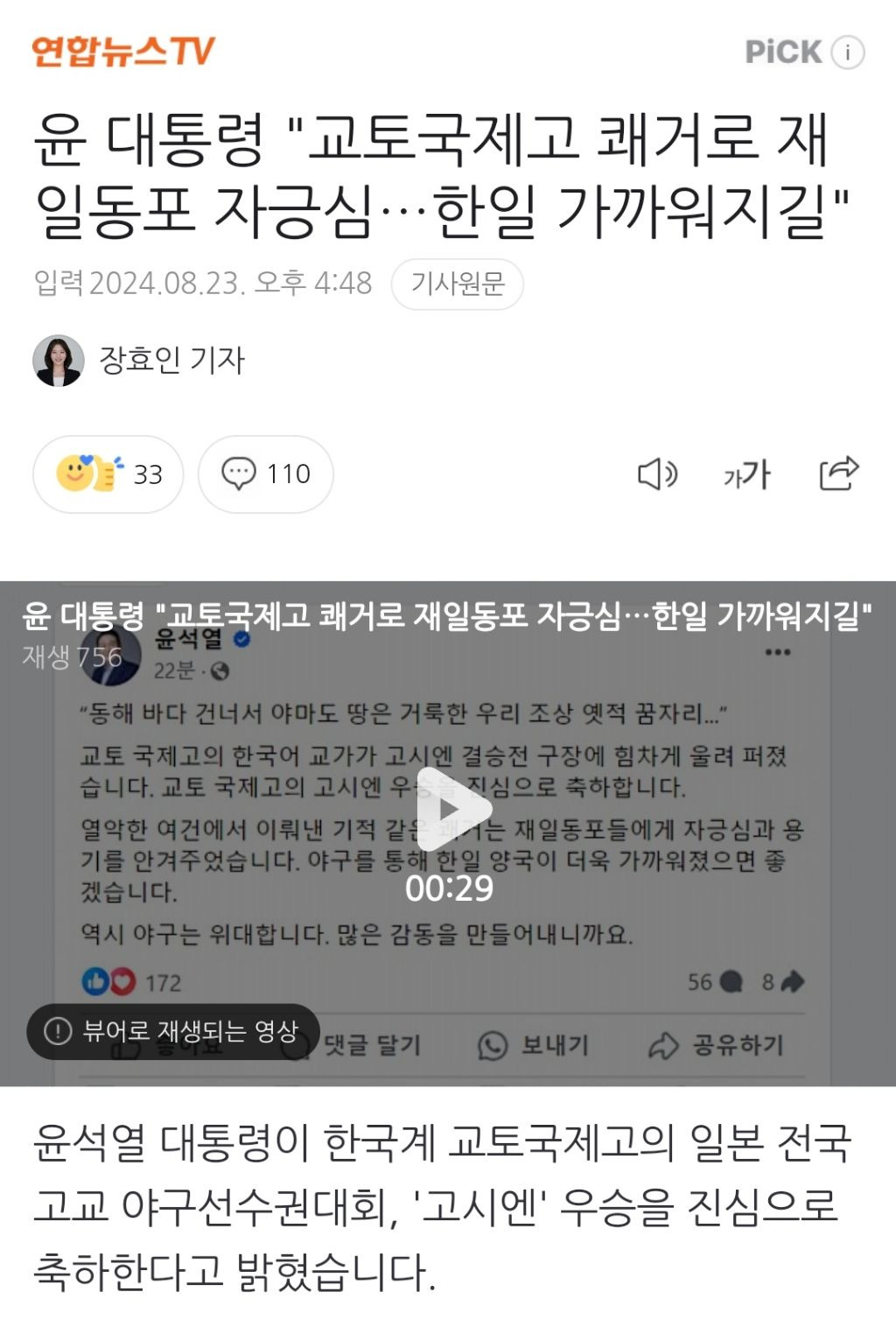 [여시뉴스데스크]윤 대통령 "교토국제고 쾌거로 재일동포 자긍심…한일 가까워지길" 작성자천리길|작성시간24.08.23|조회수1,318 목록 댓글 42 글자크기 작게가 글자크기 크게가 출처: https://naver.me/FHluSdkp윤 대통령 "교토국제고 쾌거로 재일동포 자긍심…한일 가까워지길"윤석열 대통령이 한국계 교토국제고의 일본 전국 고교 야구선수권대회, '고시엔' 우승을 진심으로 축하한다고 밝혔습니다. 윤 대통령은 오늘(23일) SNS를 통해 "열악한 여건에서 이뤄낸 기적 같은n.news.naver.com이하 생략전문 출처로 다음검색 현재 게시글 추가 기능 열기 북마크 공유하기 신고 센터로 신고 댓글 댓글 42 댓글쓰기 답글쓰기 댓글 리스트 답댓글 작성자슬로운 | 작성시간 24.08.24 222 작성자별거북 | 작성시간 24.08.23 하 ㅁ시팔 진짜 작성자명료 | 작성시간 24.08.23 닥쳐 작성자하루일똥은축복이다 | 작성시간 24.08.24 쟤 진심맞음 이건 작성자옥스스 | 작성시간 24.08.24 매국노 댓글 전체보기
