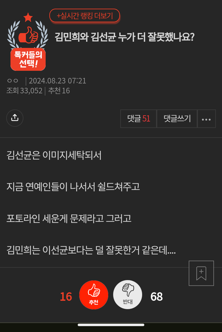 김민희는 커리어하이일때 다 끊기고.. 모든걸 잃었으니까 이선균이랑 비교해서.. 이선균은 추앙받는데 김민희는? 이거인듯