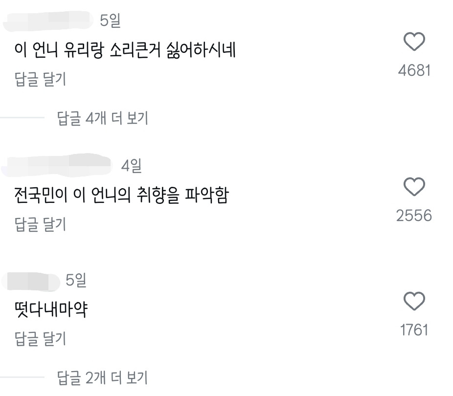 작성자되물림(x)대물림(o) 작성시간 24.08.24 뭔가나랑감각비슷한듯ㅋㅋㅋㅋㅋㅋㅋㅋㅋㅋㅋㅋ호불호거의일치햌ㅋㅋ