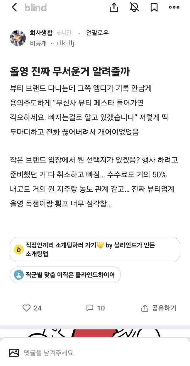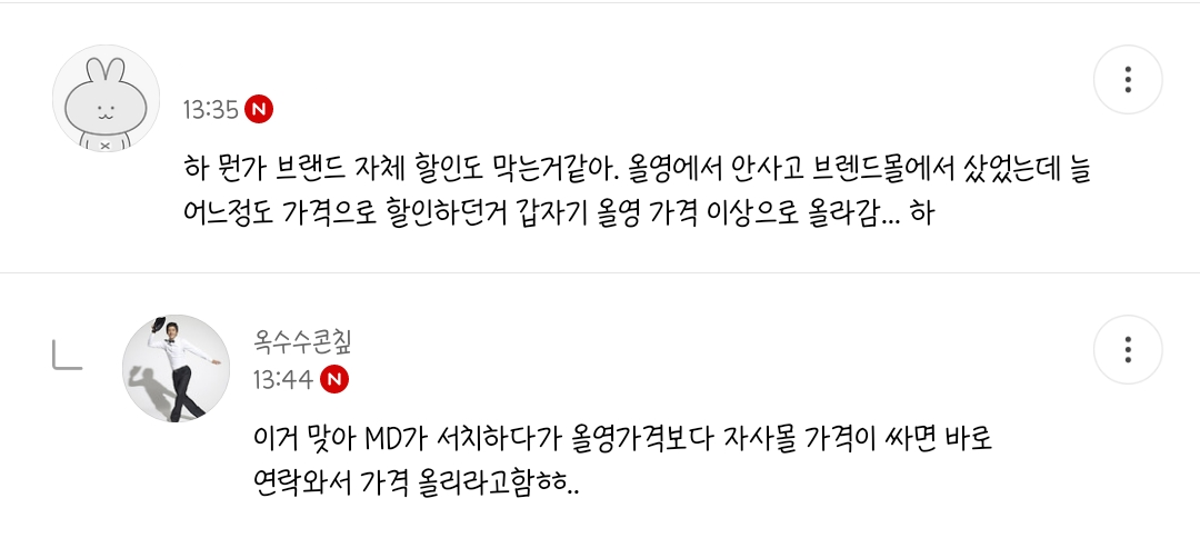 [흥미돋]블라에 올라온 올리브영 갑질 (횡포 추가) 작성자망글어진곰 망곰이|작성시간24.08.24|조회수22,017 목록 댓글 127 글자크기 작게가 글자크기 크게가 출처: 여성시대 망글어진곰 망곰이올영 괘씸하니까 쿠팡가자 XXX쿠팡도 독과점 심한 놈들임차라리 자사몰 가서 사자타브랜드 행사 들어가지 말라고 협박함올영 독점만 없어져도 화장품 거품 70%는 빠질 듯+) 같은 야시가 알려준 또다른 횡포 추가 다음검색 현재 게시글 추가 기능 열기 북마크 공유하기 신고 센터로 신고 댓글 댓글 127 댓글쓰기 답글쓰기 댓글 리스트 작성자여름가을겨울봄온다 | 작성시간 24.08.24 공홈에서 사는게 젤 낫더라고 작성자러키비키 | 작성시간 24.08.24 올영 세일도 세일처럼 안느껴짐 그러다보니 이미지도 ㅂㄹ인데 갑질까지...불매 작성자watuwnt | 작성시간 24.08.24 뭐야 개무삽네 작성자호롤랄라 | 작성시간 24.08.24 와 미친거아냐??????진짜 걍 횡포네? 이제 올영에서 안사고 딴데서 사야겠네 독점 막아 작성자R=vd가족 | 작성시간 24.08.25 올영에서 테스트해보고 인터넷에서 삼ㅋㅋㅋㅋ 댓글 전체보기