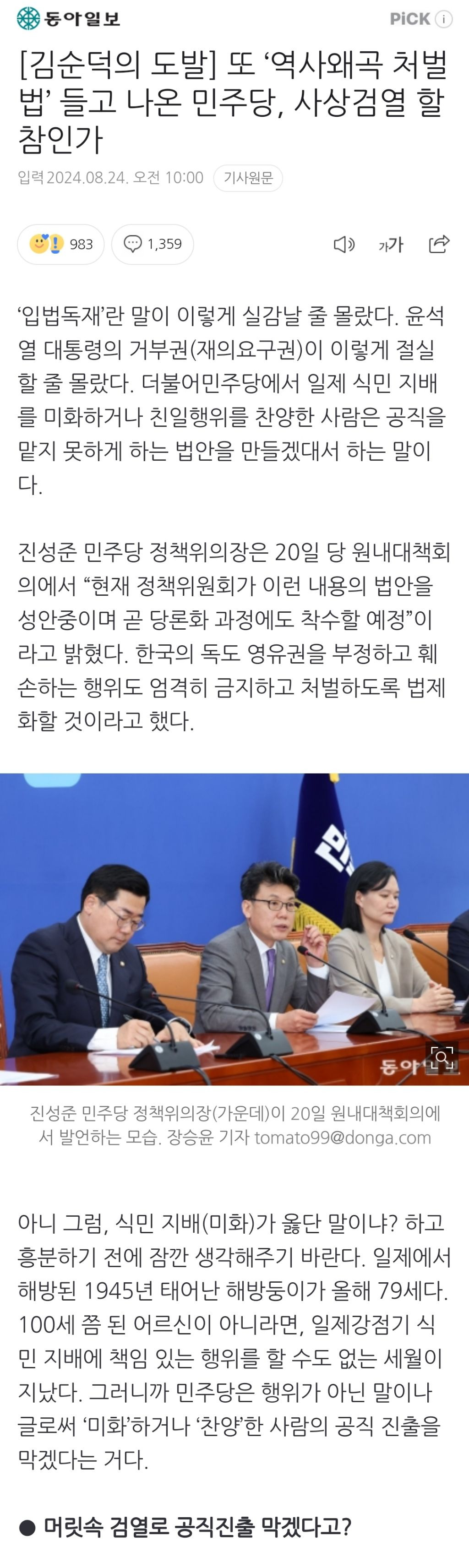 [스크랩] [여시뉴스데스크]또 ‘역사왜곡 처벌법’ 들고 나온 민주당, 사상검열 할 참인가 작성자천리길|작성시간24.08.25|조회수1,008 목록 댓글 26 글자크기 작게가 글자크기 크게가 출처: https://naver.me/FA2QaJtz[김순덕의 도발] 또 ‘역사왜곡 처벌법’ 들고 나온 민주당, 사상검열 할 참인가‘입법독재’란 말이 이렇게 실감날 줄 몰랐다. 윤석열 대통령의 거부권(재의요구권)이 이렇게 절실할 줄 몰랐다. 더불어민주당에서 일제 식민 지배를 미화하거나 친일행위를 찬양한 사람은 공n.news.naver.com이하 생략전문 출처로 다음검색 스크랩 원문 : *여성시대* 차분한 20대들의 알흠다운 공간 현재 게시글 추가 기능 열기 북마크 공유하기 신고 센터로 신고 댓글 댓글 26 댓글쓰기 답글쓰기 댓글 리스트 답댓글 작성자대체휴무 | 작성시간 24.08.25 완전동감 작성자히치하이킹 | 작성시간 24.08.25 한국인이 당연한 소리를... 작성자전정국밥 | 작성시간 24.08.25 2찍 매국 친일파들이 발작할 기사군 ㅋㅋㅋㅋ 작성자NewJeans! | 작성시간 24.08.25 역시 조중동일줄 작성자Thing__0401 | 작성시간 24.08.25 한국사람 맞나 검증해야지 지금은 아닌거같으니까 ㅋ 댓글 전체보기