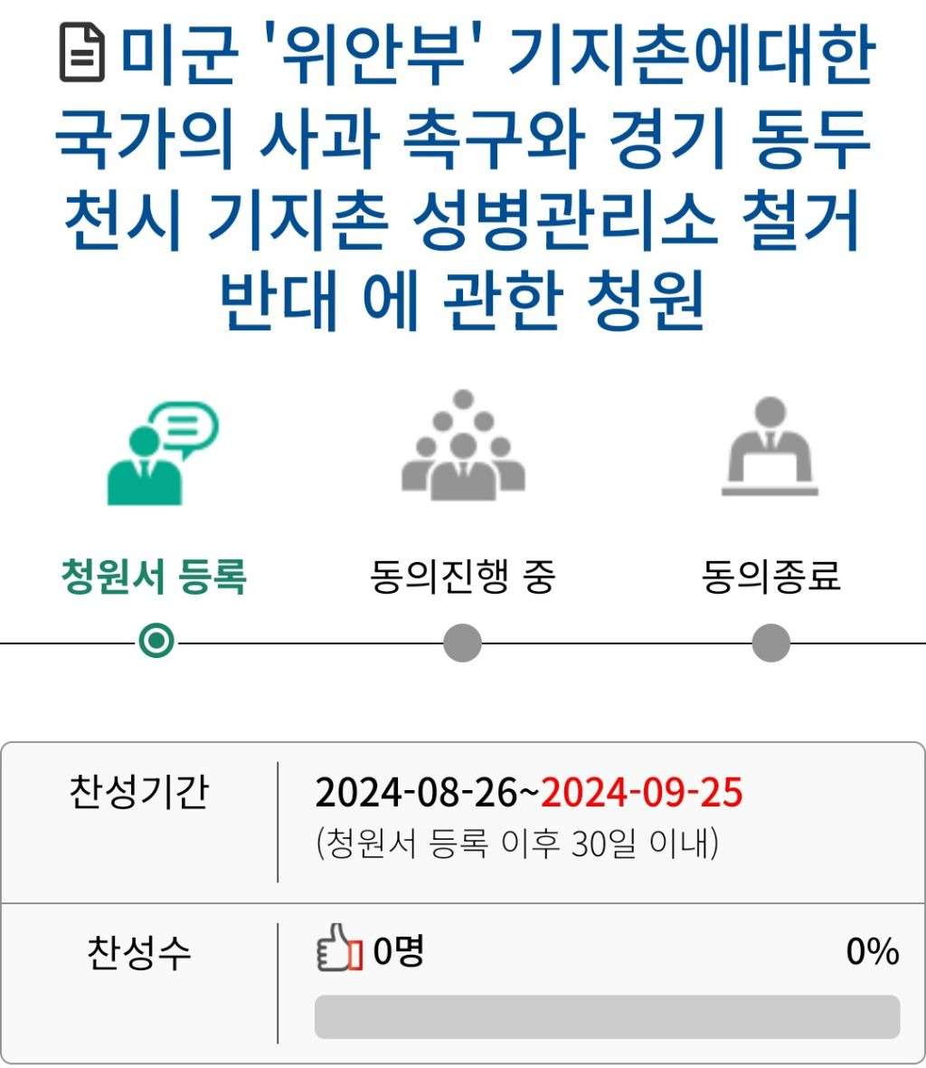 국가가 과거를 반성한다면 역사적 가치를 수호하기 위하여 동두천시의 기지촌 성병관리소를 철거하는것을 막고 보존하며, 피해자에게 사과와 배상을 해야함을 말씀드리며 청원을 마치겠습니다.
