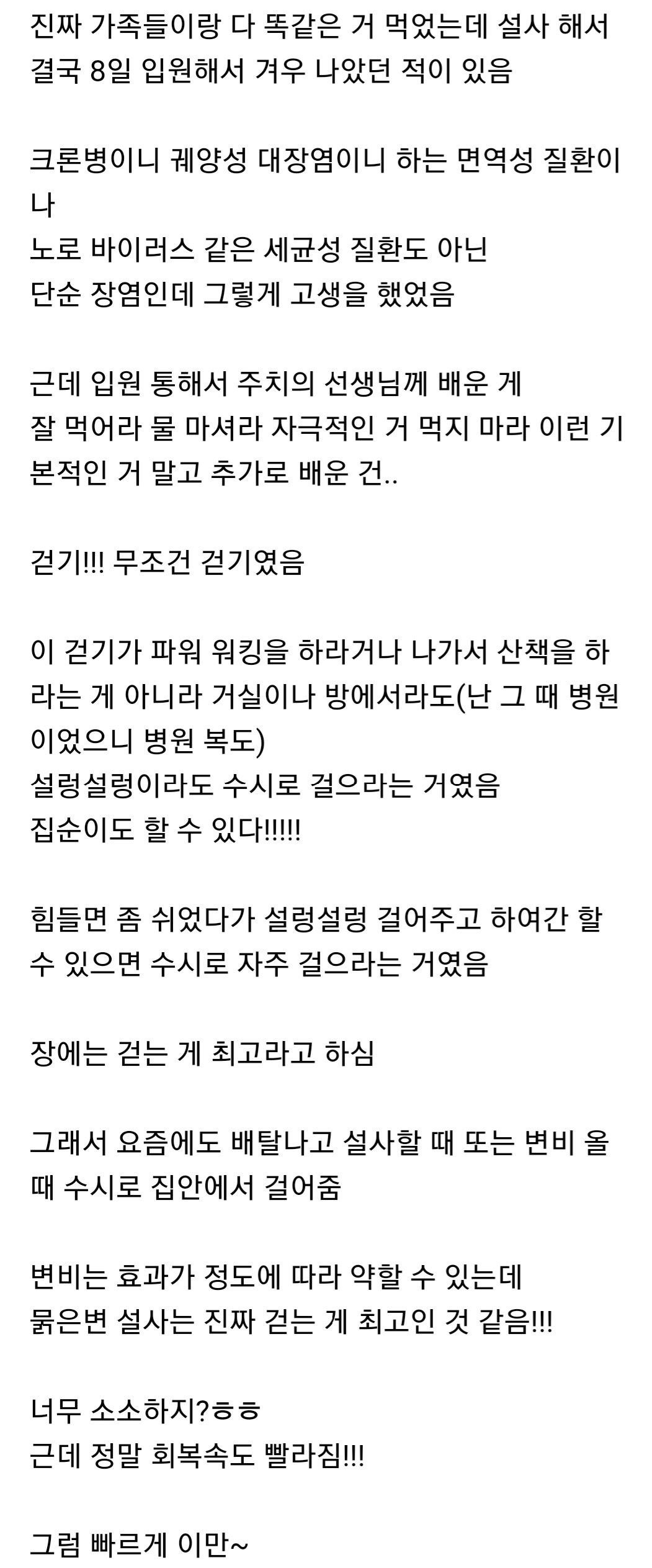 작성자오래된태잎속 작성시간 24.08.26 설사할때 걷는거 직빵이야 걸어서 후딱후딱 화장실 가서 싸면 됨 근데 걷는다고 멀리 나가서 걷다가 곤란하지 말고 그냥 집 안에서나 근처에서 하기를..ㅋㅋㅋ