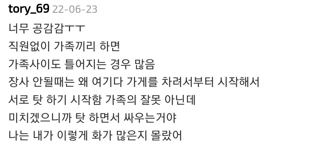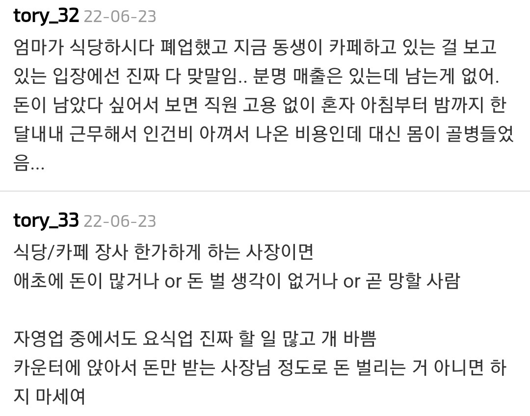 작성자곱전존맛 작성시간 24.08.29 자영업카페만 가봐도 앓는 사람 많음 하기전에 꼭 달글이나 카페 보고 생각해봐 진짜힘들어