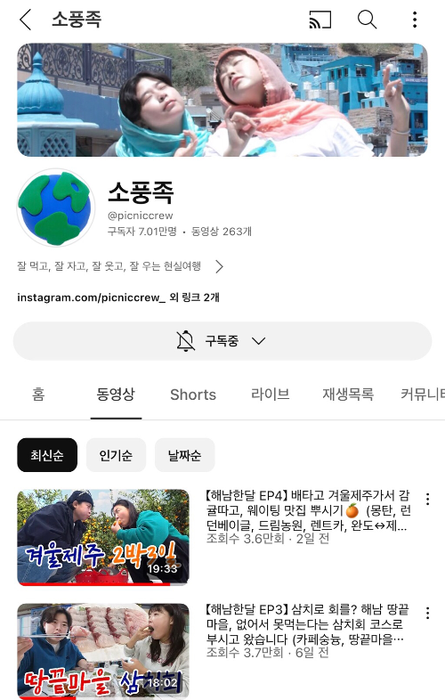 요즘 급부상중인 여행유튜버 소풍족 !