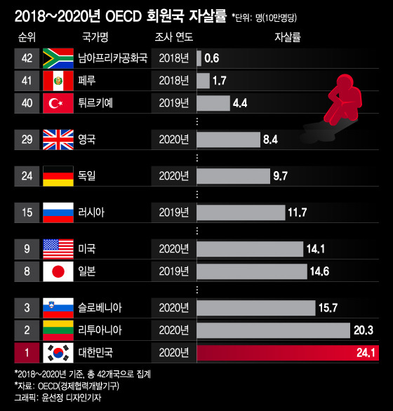 국제적으로 비교해봐도 우리나라 노인들의 자살률은 OECD 1위라는 불명예를 안고 있음