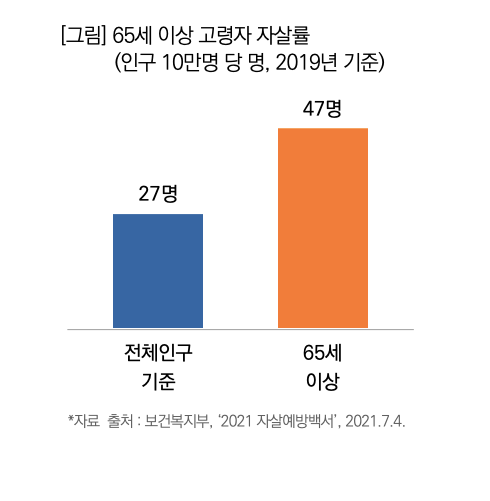 보건복지부의 '2019 자살예방백서‘에 따르면 우리나라 65세 이상 노인자살률(인구 10만명당)은 2015년 기준 58.6명으로 OECD 회원국 18.8명보다 훨씬 높고 2위 슬로베니아 38.7명과도 큰 격차를 이루고 있음