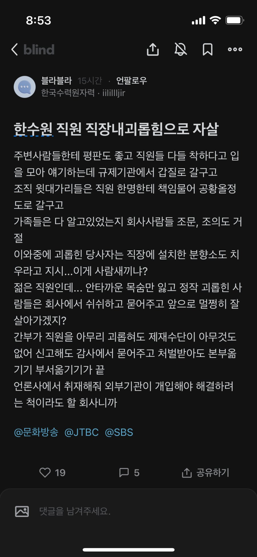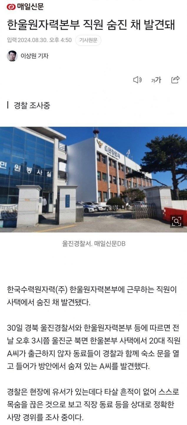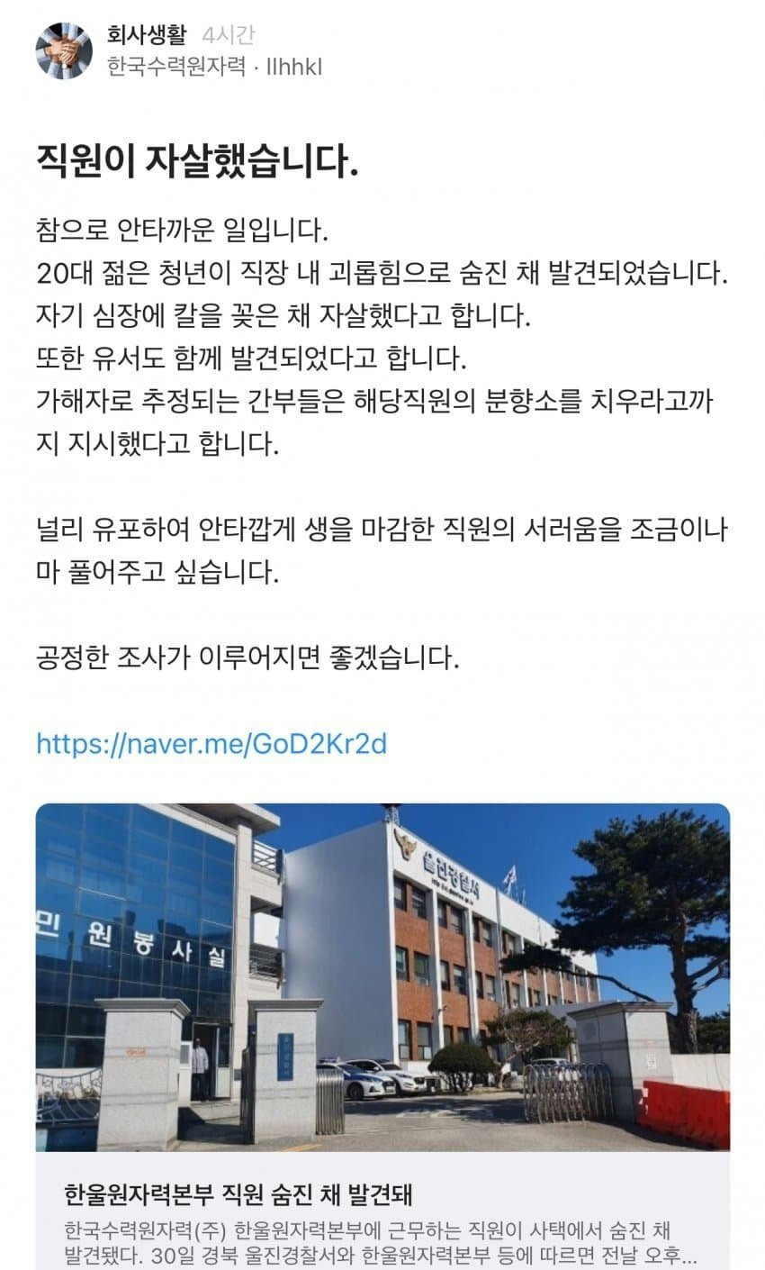[스크랩] [기타]한수원 20대 직원 자살 기사. 작성자토닉워터|작성시간24.08.31|조회수153,550 목록 댓글 520 글자크기 작게가 글자크기 크게가 다음검색 스크랩 원문 : 이종격투기 현재 게시글 추가 기능 열기 북마크 공유하기 신고 센터로 신고 댓글 댓글 520 댓글쓰기 답글쓰기 댓글 리스트 작성자뽕짜리몽땅 | 작성시간 24.09.07 삼가 고인의 명복을 빕니다부디 이승에서의 일 다 잊으시고 평안하시길 빕니다 작성자나야나로또당첨자 | 작성시간 24.09.07 삼가 고인의 명복을 빕니다 작성자ocean quiet | 작성시간 24.09.07 세상에 아...... 작성자쩡블리 | 작성시간 24.09.08 삼가 고인의 명복을 빕니다 작성자대기업가자 | 작성시간 24.09.08 삼가 고인의 명복을 빕니다묻히지 않게 해주세요 댓글 전체보기