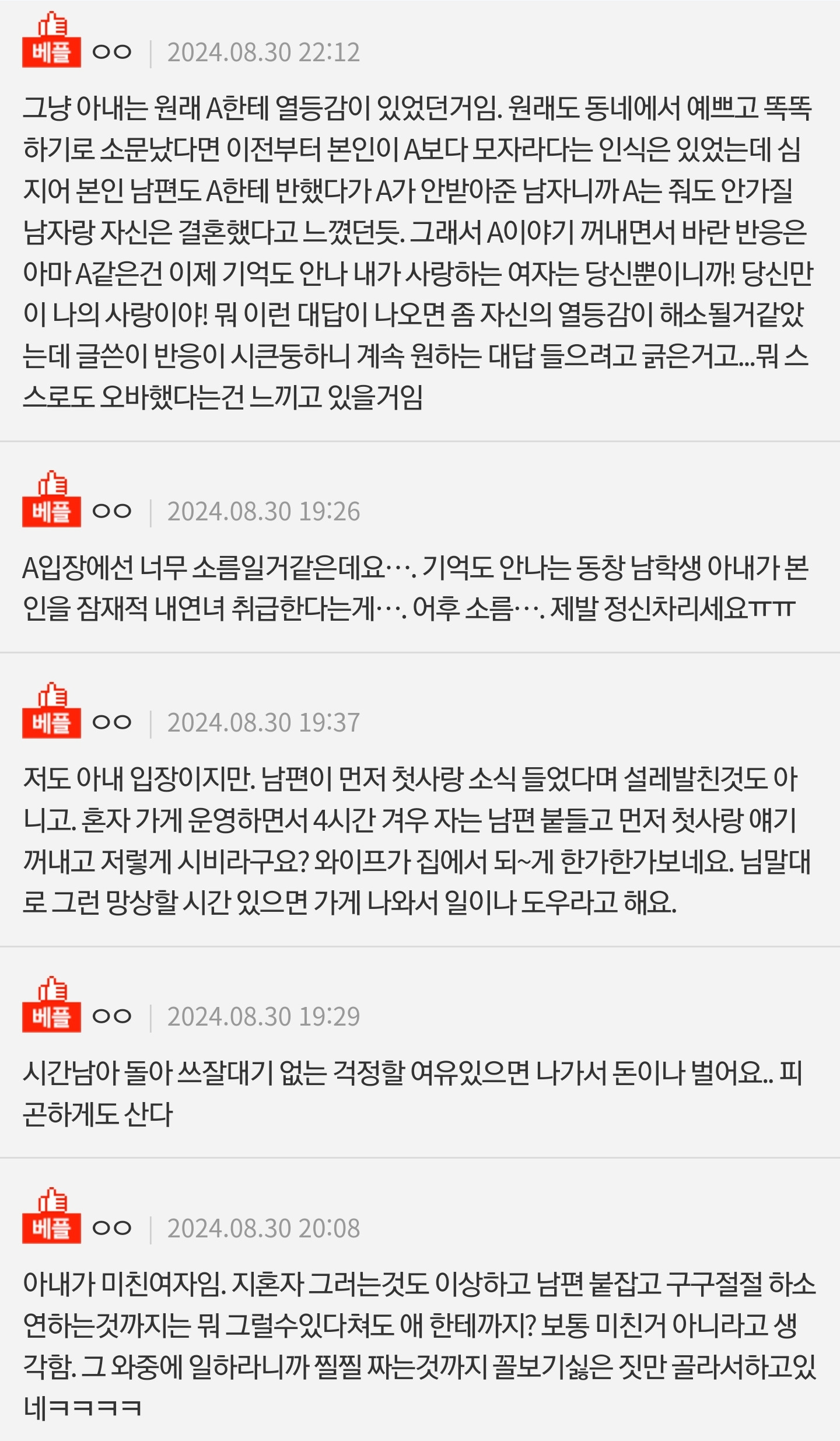 다음날 아침에도 A가 이번 동창회에 나온다고 하면 갈거냐는둥 또 시비길래 결국 폭발해서 내가 지금 첫사랑이나 그리워하고 있을 정도로 한가해보이냐고, 너는 집에서 혼자 온갖 망상하는거보니 한가해보이는데 한가하면 나와서 가게일이나 좀 도와라 했더니 왜 과민반응하냐며 우네요. 남편 첫사랑이 신경 안쓰이는 아내가 어디있냐면서요. 제 입장에선 환장할 노릇인게 사귄것도 아니고 제 일방적인 짝사랑이어서 둘만의 추억같은게 있는것도 아닌데 신경쓰일 일이 뭐가 있으며, 저도 이제 A한테 관심같은거 없을뿐더러 A는 제 아내가 이런 생각 하는것조차 불쾌하겠죠. 전남편이 변호사랬나 의사랬나 여튼 사짜직업이었던걸로 아는데 촌동네 작은 가게하는 고졸 유부남이랑 엮는거 자체가 웃긴거 아닌가요? 이렇게 따졌더니 그럼 그런 저랑 사는 본인은 뭐냐며, A는 니가 감히 범접하지 못하는 급이 다른 여자라고 생각하는거냐며 짜증을 내는데..무슨 드라마에 나오는 의부증 환자같더군요.
