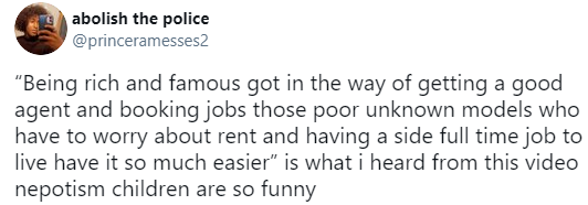 난 얘가 “난 부유하고 유명해서 좋은 에이전트 불러서 많은 일들을 얻었고 월세 걱정하면서 알바도 하는 무명의 가난한 모델들은 나보다 훨씬 쉽게 살아”라고 말하는 거 같아