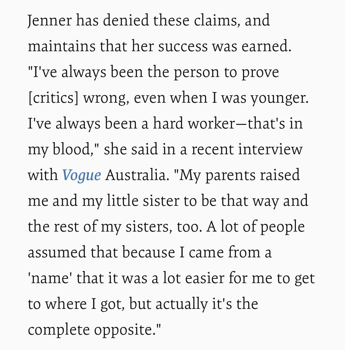 많은 사람들이 제가 유명한 집안에서 왔기 때문에 쉽게 지금 제 위치에 온 거라고 추측하는데, 사실 그건 완전 반대에요.”
