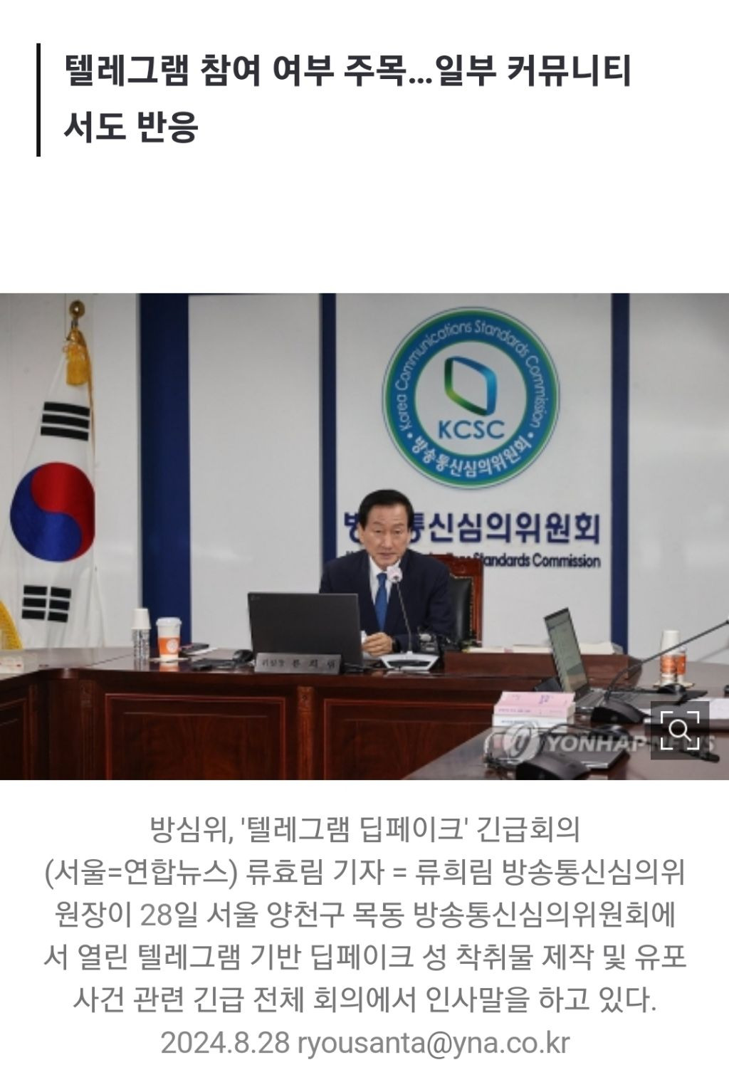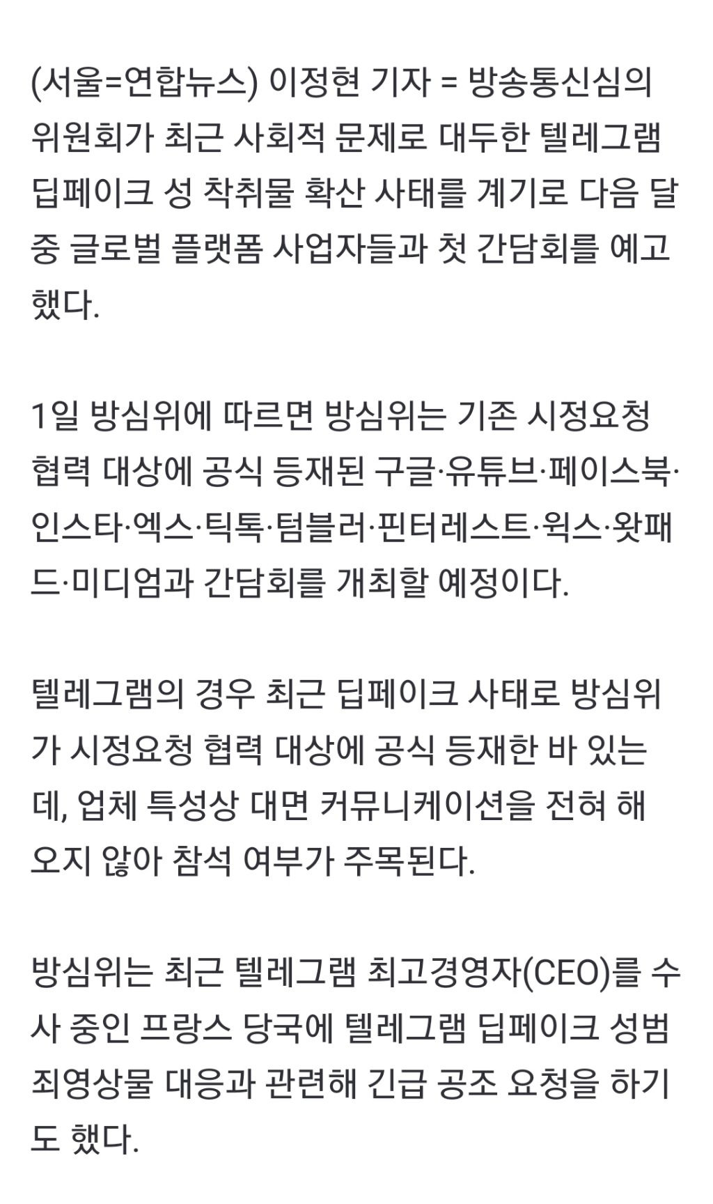 [여시뉴스데스크]방심위, 딥페이크 사태 계기 플랫폼 사업자 내달 소집 작성자기쁨이슬픔이|작성시간24.09.01|조회수702 목록 댓글 4 글자크기 작게가 글자크기 크게가 출처: https://n.news.naver.com/mnews/article/001/0014904548방심위, 딥페이크 사태 계기 플랫폼 사업자 내달 소집텔레그램 참여 여부 주목…일부 커뮤니티서도 반응 방송통신심의위원회가 최근 사회적 문제로 대두한 텔레그램 딥페이크 성 착취물 확산 사태를 계기로 다음 달 중 글로벌 플랫폼 사업자들과 n.news.naver.com전문 출처로 다음검색 현재 게시글 추가 기능 열기 북마크 공유하기 신고 센터로 신고 댓글 댓글 4 댓글쓰기 답글쓰기 댓글 리스트 작성자기쁨이슬픔이 작성자 본인 여부 작성자 | 작성시간 24.09.01 이미지 확대 작성자리컴 | 작성시간 24.09.01 댓완 추천완 작성자엔요와요플레 | 작성시간 24.09.01 완완 작성자따나나발기 | 작성시간 24.09.01 완완 댓글 전체보기