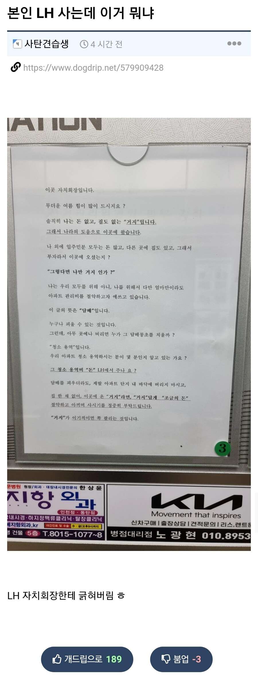 작성자어 너 뭐하는? 작성시간 24.09.02 나도 입주민 무개념 흡연 때문에 개빡치지만.. 자치회장이 저렇게 대놓고 분란조장해봤자 해결도 안 되고 편갈라 싸움밖에 안 나더라고.. 좋은 대처는 진짜 아닌데ㅠ 하 그냥 담배 자체를 조져야..^^