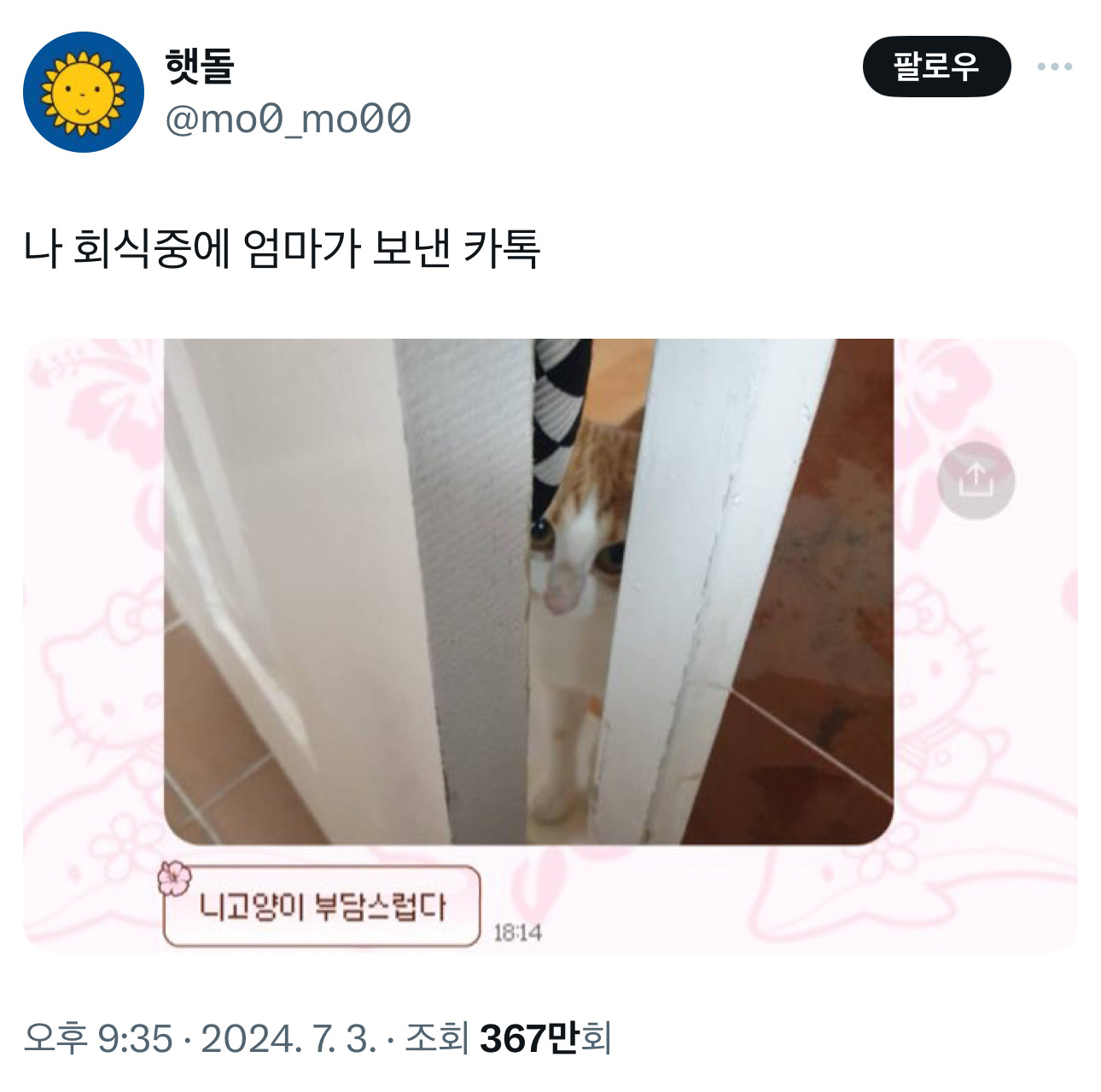 [흥미돋]니고양이 부담스럽다 작성자떡대수|작성시간24.09.01|조회수15,888 목록 댓글 18 글자크기 작게가 글자크기 크게가 출처: 여성시대 떡대수https://x.com/2dungdung2/status/1829413267846124020?s=46X의 ♡´・ᴗ・`♡님(@2dungdung2) x.com하 ㅋ 귀여워 다음검색 현재 게시글 추가 기능 열기 북마크 공유하기 신고 센터로 신고 댓글 댓글 18 댓글쓰기 답글쓰기 댓글 리스트 작성자녹차라떼엥 | 작성시간 24.09.01 내 고양이도ㅋㅋㅋㅋ 이미지 확대 작성자노우바 | 작성시간 24.09.01 ㄱㅇㅇ ㅠㅠㅠㅠㅠㅠㅠㅠㅠㅠㅠㅠㅠㅠㅠㅠㅠㅠㅠㅠ 작성자당신고앵뚱쭝해요 | 작성시간 24.09.01 제발꿀무야 흑흑 작성자미쯔사료 | 작성시간 24.09.01 😭 작성자왕코강아지콜렉터 | 작성시간 24.09.01 머므너믄너ㅡ너무너무귀여워 댓글 전체보기