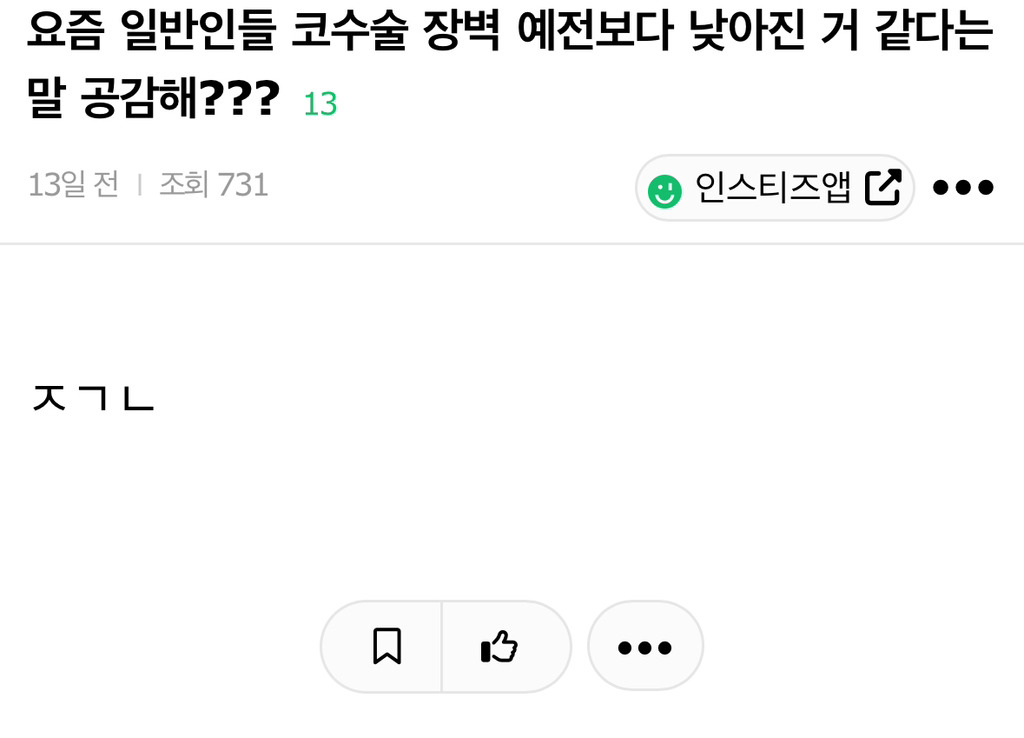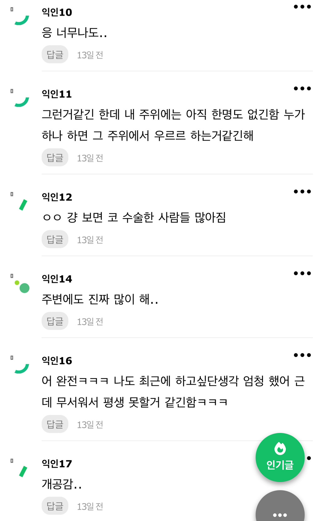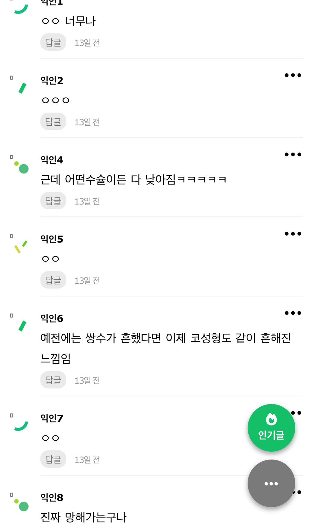 [흥미돋]요즘 일반인들 코수술 장벽 예전보다 낮아진 거 같다는 말 공감해?? 작성자나는야여시라노|작성시간24.09.01|조회수5,332 목록 댓글 32 글자크기 작게가 글자크기 크게가 출처: 여성시대 (나는야여시라노)인스티즈 펌내 생각엔 릴스도 한몫한듯..평소에 할생각없어도 알고리즘 타면비포애프터 계속 뜨더라 다음검색 현재 게시글 추가 기능 열기 북마크 공유하기 신고 센터로 신고 댓글 댓글 32 댓글쓰기 답글쓰기 댓글 리스트 작성자작약꼬치 | 작성시간 24.09.01 수술은 점점 장벽이 낮아지지 작성자떵순이 | 작성시간 24.09.01 유툽 보면 가슴더 개마니함... 작성자샤베트 | 작성시간 24.09.01 위험한거 아냐 ㅠㅠ? 작성자바바바바숑 | 작성시간 24.09.01 내 주변엔 없엉.. 작성자잼시가나라다 | 작성시간 24.09.02 코랑 가슴 진짜 마니함 댓글 전체보기
