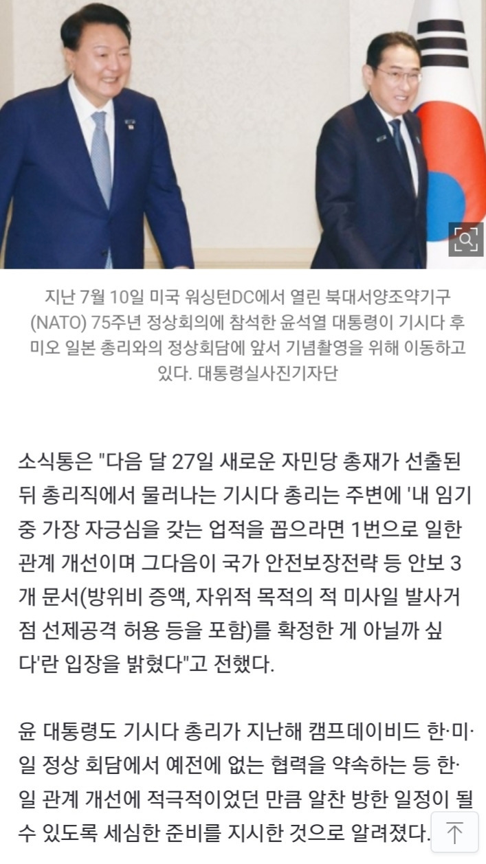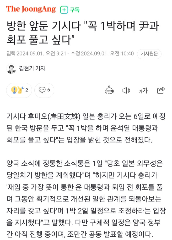 [여시뉴스데스크]방한 앞둔 기시다 "꼭 1박하며 尹과 회포 풀고 싶다" 작성자유진박|작성시간24.09.01|조회수713 목록 댓글 9 글자크기 작게가 글자크기 크게가 출처: https://naver.me/xMjjJQAI방한 앞둔 기시다 "꼭 1박하며 尹과 회포 풀고 싶다"기시다 후미오(岸田文雄) 일본 총리가 오는 6일로 예정된 한국 방문을 두고 "꼭 1박을 하며 윤석열 대통령과 회포를 풀고 싶다"는 입장을 밝힌 것으로 전해졌다. 양국 소식에 정통한 소식통은 1일n.news.naver.com 다음검색 현재 게시글 추가 기능 열기 북마크 공유하기 신고 센터로 신고 댓글 댓글 9 댓글쓰기 답글쓰기 댓글 리스트 작성자도른생 | 작성시간 24.09.01 천생연분이네 작성자문재인 | 작성시간 24.09.01 😐 작성자초기화한날에그타르트먹음 | 작성시간 24.09.01 ? 들어오지마 작성자비오는여름날 | 작성시간 24.09.01 호구랑 얘기하고 싶단 뜻이네 작성자남자비판플길게쓰기위원회 | 작성시간 24.09.01 둘이연애하나보네 댓글 전체보기
