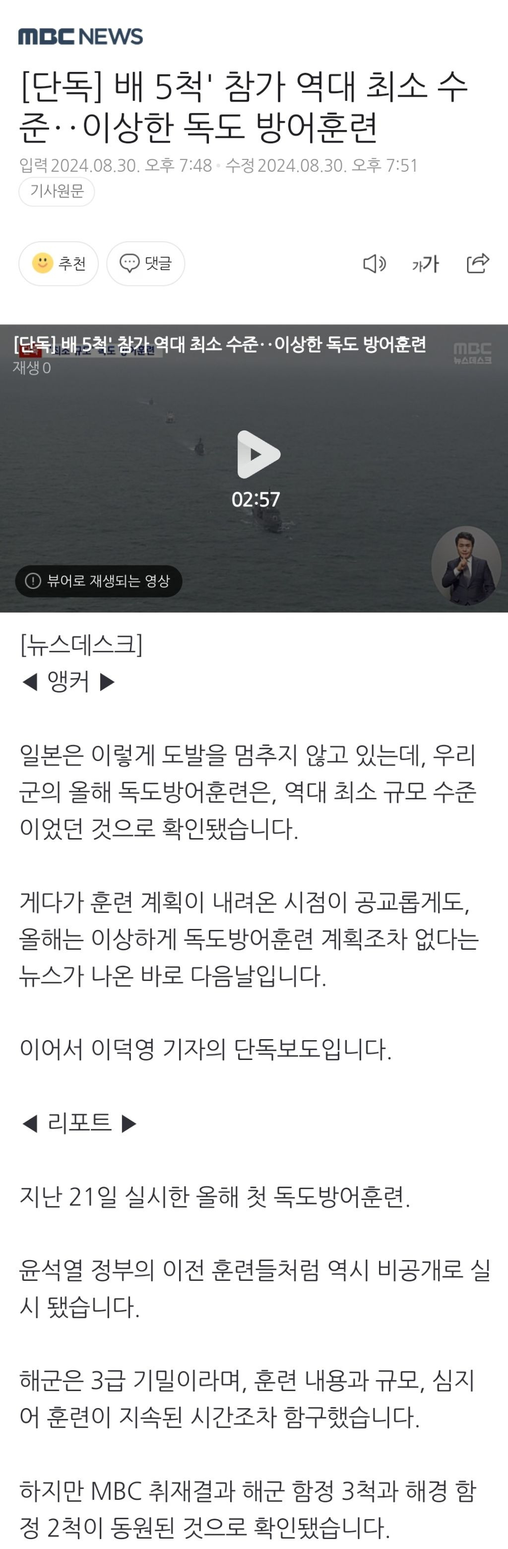 [스크랩] [여시뉴스데스크][단독] 배 5척' 참가 역대 최소 수준‥이상한 독도 방어훈련 작성자천리길|작성시간24.09.01|조회수645 목록 댓글 2 글자크기 작게가 글자크기 크게가 출처: https://naver.me/GBF56tMd[단독] 배 5척' 참가 역대 최소 수준‥이상한 독도 방어훈련◀ 앵커 ▶ 일본은 이렇게 도발을 멈추지 않고 있는데, 우리 군의 올해 독도방어훈련은, 역대 최소 규모 수준이었던 것으로 확인됐습니다. 게다가 훈련 계획이 내려온 시점이 공교롭게도, 올해n.news.naver.com이하 생략전문 출처로 다음검색 스크랩 원문 : *여성시대* 차분한 20대들의 알흠다운 공간 현재 게시글 추가 기능 열기 북마크 공유하기 신고 센터로 신고 댓글 댓글 2 댓글쓰기 답글쓰기 댓글 리스트 작성자레몬소치 | 작성시간 24.09.01 ...? 이게 대체.. 작성자엥니먼 | 작성시간 24.09.01 나라 망했어 진짜 댓글 전체보기