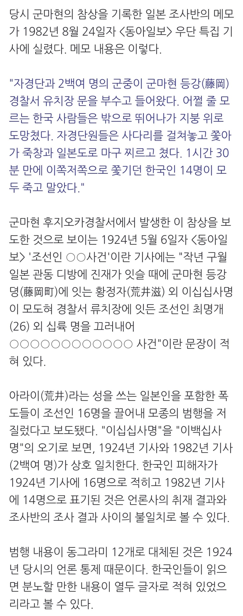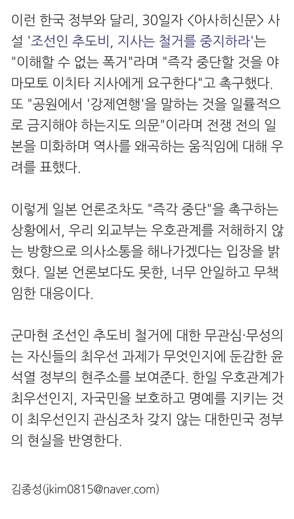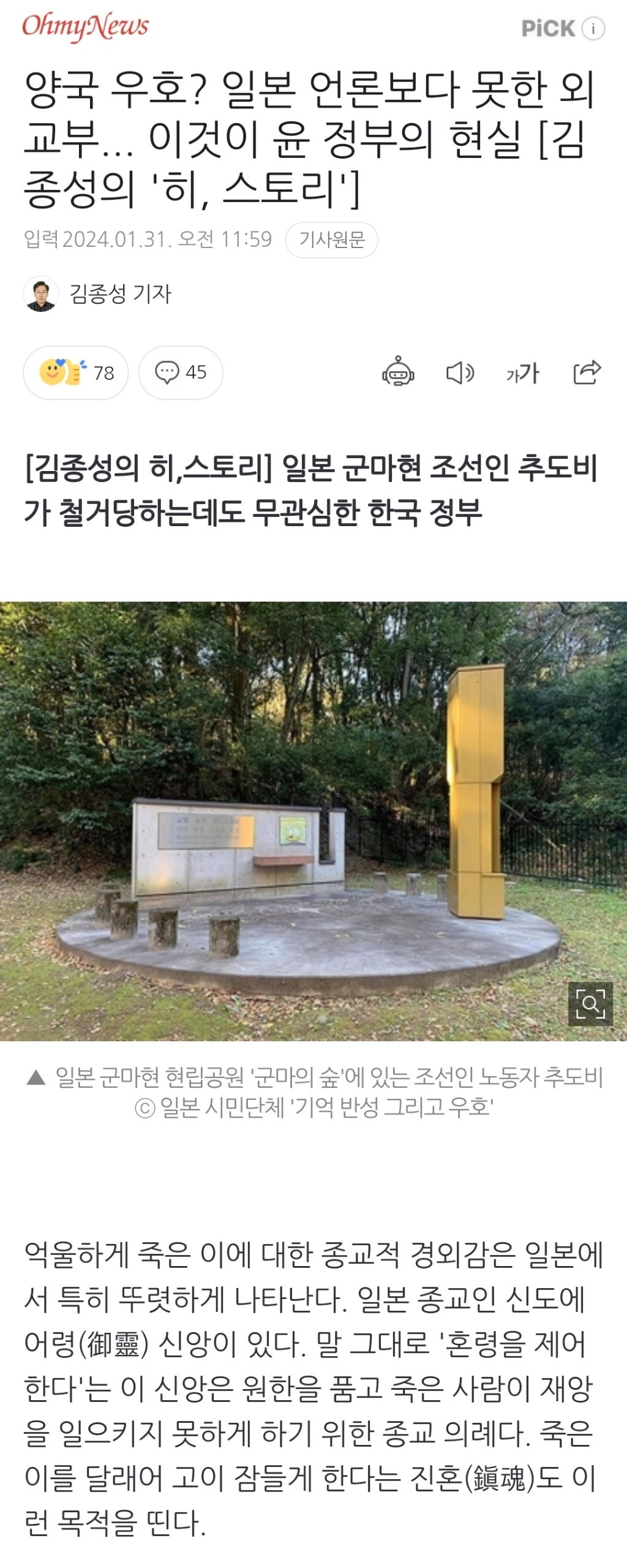 [스크랩] [여시뉴스데스크]양국 우호? 일본 언론보다 못한 외교부... 이것이 윤 정부의 현실 작성자천리길|작성시간24.09.01|조회수269 목록 댓글 0 글자크기 작게가 글자크기 크게가 출처 : https://naver.me/5HtLHJc7양국 우호? 일본 언론보다 못한 외교부... 이것이 윤 정부의 현실 [김종성의 '히, 스토리']일본 군마현 조선인 추도비가 철거당하는데도 무관심한 한국 정부 ▲ 일본 군마현 현립공원 '군마의 숲'에 있는 조선인 노동자 추도비 ⓒ 일본 시민단체 '기억 반성 그리고 우호' 억울하게 죽은 n.news.naver.com전문 출처로중략중략 다음검색 스크랩 원문 : *여성시대* 차분한 20대들의 알흠다운 공간 현재 게시글 추가 기능 열기 북마크 공유하기 신고 센터로 신고 댓글 댓글 0 댓글쓰기 답글쓰기 댓글 리스트