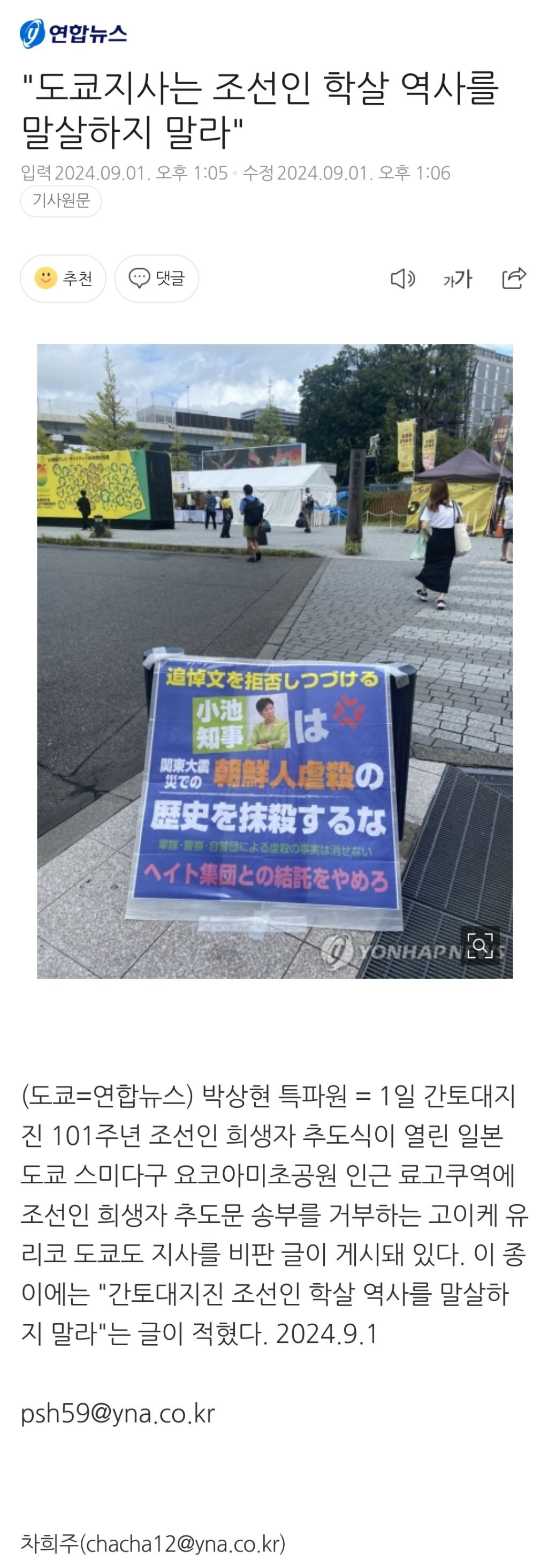 [여시뉴스데스크]"도쿄지사는 조선인 학살 역사를 말살하지 말라" 작성자천리길|작성시간24.09.01|조회수555 목록 댓글 2 글자크기 작게가 글자크기 크게가 출처: https://naver.me/GHvvULw8"도쿄지사는 조선인 학살 역사를 말살하지 말라"박상현 특파원 = 1일 간토대지진 101주년 조선인 희생자 추도식이 열린 일본 도쿄 스미다구 요코아미초공원 인근 료고쿠역에 조선인 희생자 추도문 송부를 거부하는 고이케 유리코 도쿄도 지사n.news.naver.com원문 출처로 다음검색 현재 게시글 추가 기능 열기 북마크 공유하기 신고 센터로 신고 댓글 댓글 2 댓글쓰기 답글쓰기 댓글 리스트 작성자뉴욕하와이비치 | 작성시간 24.09.01 쪽바리 새끼들 작성자이국종교수 | 작성시간 24.09.01 부끄러움도 모르는 새끼들 댓글 전체보기