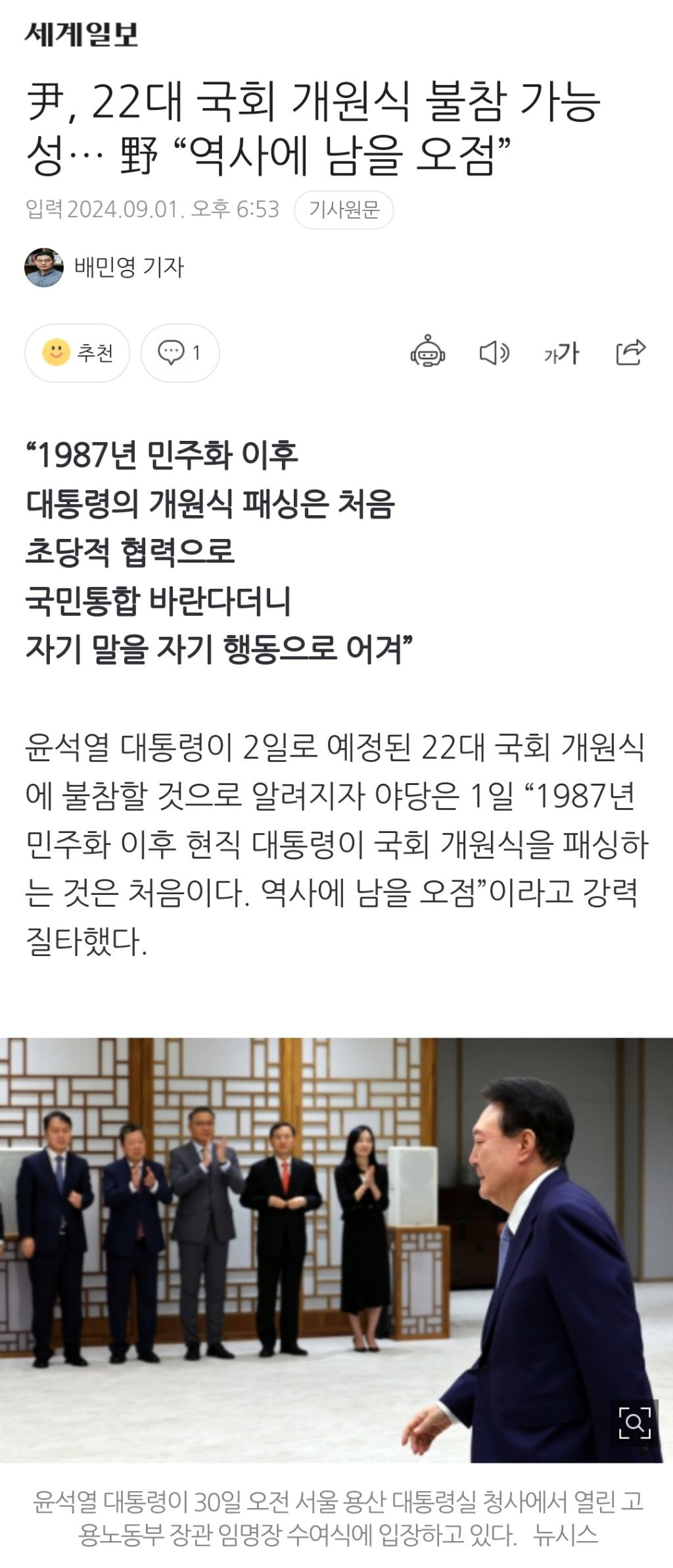 [여시뉴스데스크]尹, 22대 국회 개원식 불참 가능성… 野 “역사에 남을 오점” 작성자천리길|작성시간24.09.01|조회수494 목록 댓글 5 글자크기 작게가 글자크기 크게가 출처: https://naver.me/GEXX8m8O尹, 22대 국회 개원식 불참 가능성… 野 “역사에 남을 오점”“1987년 민주화 이후 대통령의 개원식 패싱은 처음 초당적 협력으로 국민통합 바란다더니 자기 말을 자기 행동으로 어겨” 윤석열 대통령이 2일로 예정된 22대 국회 개원식에 불참할 것으로 알n.news.naver.com전문 출처로중략 다음검색 현재 게시글 추가 기능 열기 북마크 공유하기 신고 센터로 신고 댓글 댓글 5 댓글쓰기 답글쓰기 댓글 리스트 작성자작은행복추적 | 작성시간 24.09.01 대놓고?? 이젠 놀랍지도 않음 작성자냐냐냥냐냐냥냐냐 | 작성시간 24.09.01 ㅋㅋ계엄령터뜨랴서 없앨건데 굳이 갈필요없단건가 작성자일빠친일쪽바리들당장참수형 | 작성시간 24.09.01 윤석열 이명박이랑 사겻으면 좋겠다 둘이 비슷해 작성자Ramin Karimloo | 작성시간 24.09.01 미친새끼 작성자후룰룰루롱 | 작성시간 24.09.02 ㅋㅋㅋㅌㅋㅋㅋㅋㅋㅋㅋ하 댓글 전체보기
