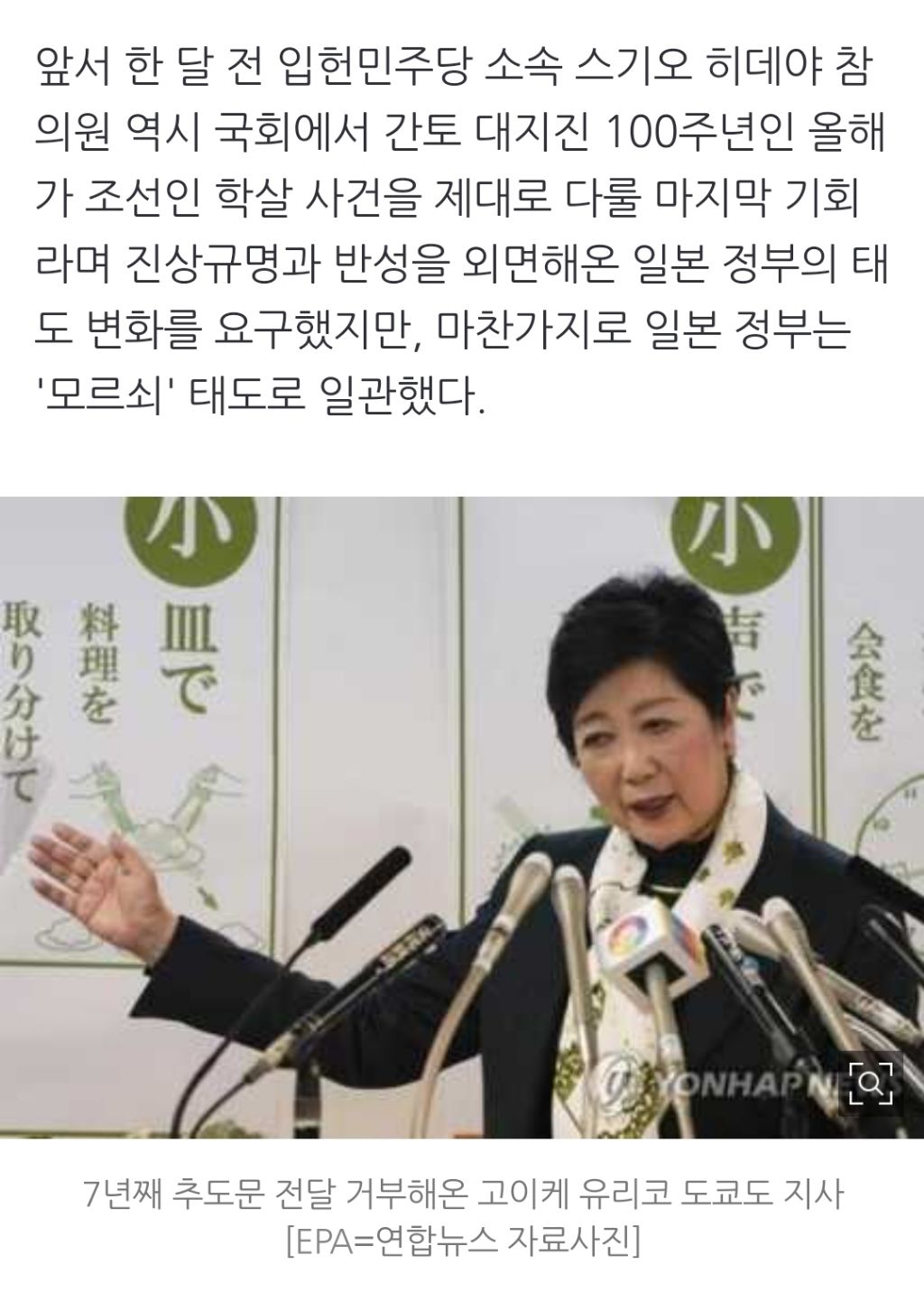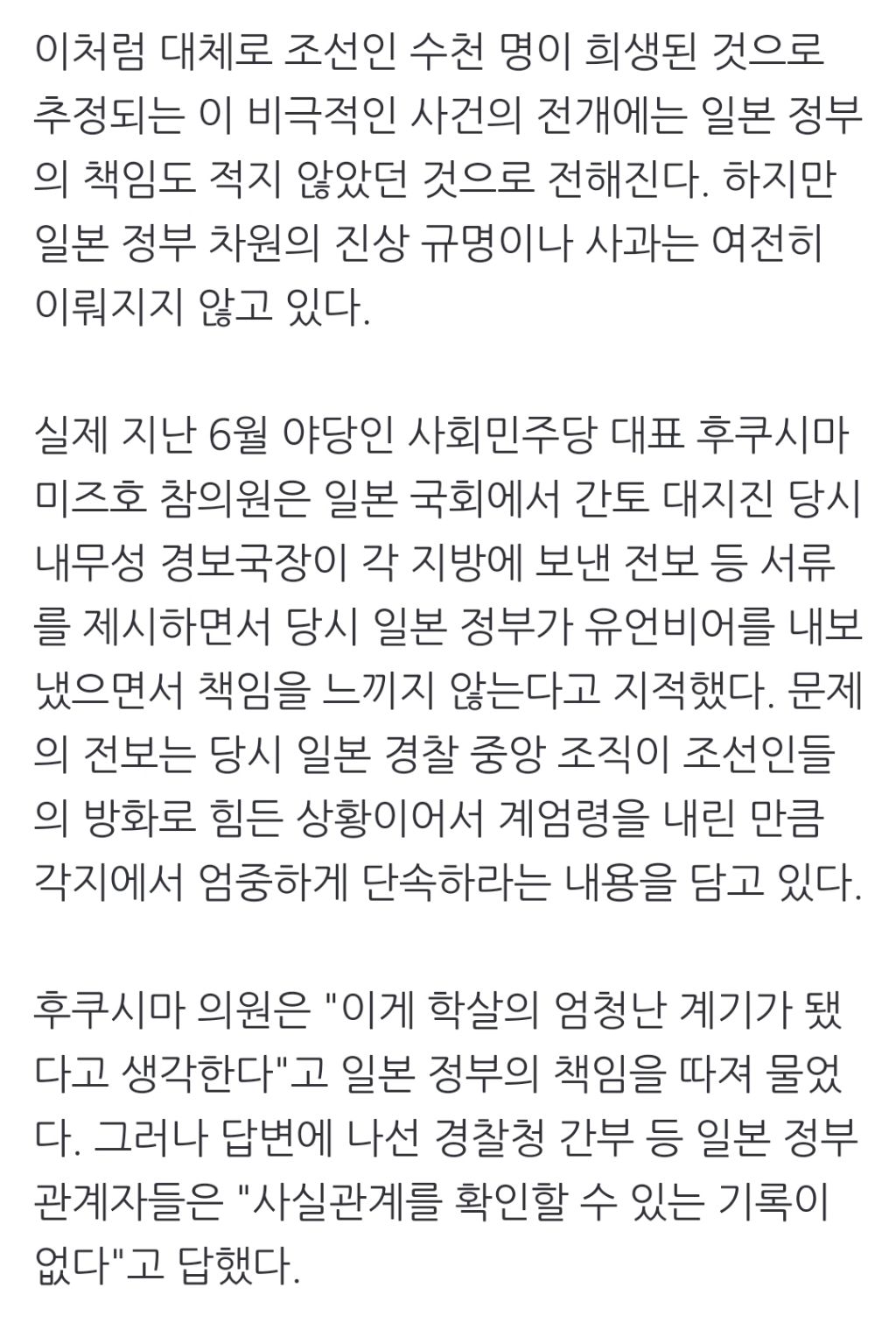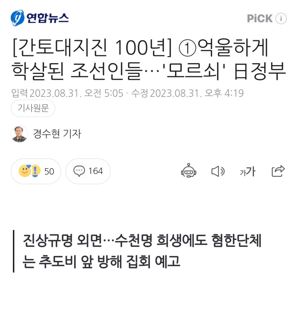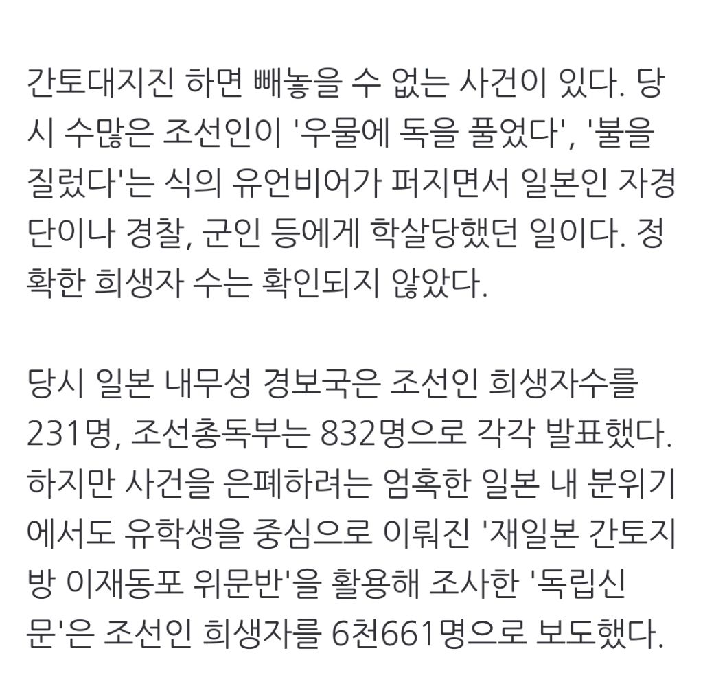 [스크랩] [여시뉴스데스크][간토대지진 100년] ①억울하게 학살된 조선인들…'모르쇠' 日정부 작성자천리길|작성시간24.09.01|조회수293 목록 댓글 1 글자크기 작게가 글자크기 크게가 출처 : https://naver.me/Fl2NNkWN[간토대지진 100년] ①억울하게 학살된 조선인들…'모르쇠' 日정부진상규명 외면…수천명 희생에도 혐한단체는 추도비 앞 방해 집회 예고 편집자 주 = 올해는 간토(關東·관동)대지진이 발생한 지 100년이 되는 해다. 이에 따라 일본에서는 당시를 되돌아보면서 n.news.naver.com전략중략이하 생략전문 출처로 다음검색 스크랩 원문 : *여성시대* 차분한 20대들의 알흠다운 공간 현재 게시글 추가 기능 열기 북마크 공유하기 신고 센터로 신고 댓글 댓글 1 댓글쓰기 답글쓰기 댓글 리스트 작성자천리길 작성자 본인 여부 작성자 | 작성시간 24.09.01 작년 기사 댓글 전체보기