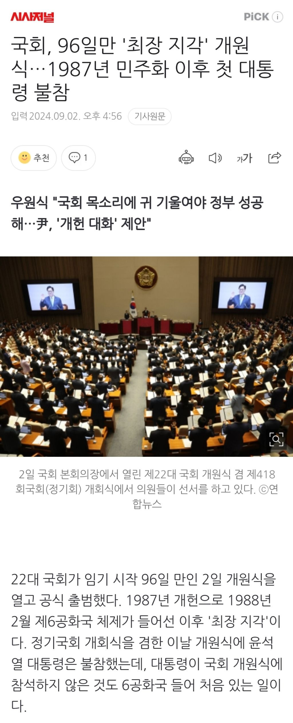 [여시뉴스데스크]국회, 96일만 '최장 지각' 개원식…1987년 민주화 이후 첫 대통령 불참 작성자천리길|작성시간24.09.02|조회수773 목록 댓글 7 글자크기 작게가 글자크기 크게가 출처: https://naver.me/xs333xoa국회, 96일만 '최장 지각' 개원식…1987년 민주화 이후 첫 대통령 불참우원식 "국회 목소리에 귀 기울여야 정부 성공해…尹, '개헌 대화' 제안" 22대 국회가 임기 시작 96일 만인 2일 개원식을 열고 공식 출범했다. 1987년 개헌으로 1988년 2월 제6공화국 체제가 들어선 이n.news.naver.com이하 생략전문 출처로🔗관련 기사https://naver.me/FCAABCe4국회, 석달 만에 ‘늑장’ 개원식…87년 이후 첫 ‘대통령 불참’22대 국회가 여야의 장기 대치 속에 임기 시작 후 96일 만인 오늘(2일) 개원식을 열었습니다. 1987년 개헌으로 1988년 2월 제6공화국 체제가 들어선 이후 ‘최장 지각’입니다. 정기국회 개회식을 겸n.news.naver.comhttps://naver.me/xuccCtw1국회, 석달만에 '최장 지각' 개원식…6공화국 첫 대통령 불참우의장 "국회 존중않고 국정성과 못내…지방선거 때 개헌 국민투표를" 고상민 계승현 조다운 기자 = 22대 국회가 여야의 장기 대치 속에 임기 시작 후 96일 만인 2일 개원식을 열었다. 1987년 개헌n.news.naver.comhttps://naver.me/FioooaFL22대 국회 96일만에 개원식…1987년 민주화 이후 첫 현직 대통령 불참정금민 조재완 김경록 한은진 기자 = 제22대 국회가 임기 시작 96일 만인 2일 개원식을 열고 공식 출범했다. 1987년 민주화 이후 처음으로 현직 대통령 연설 없는 개원이자 최장 지각 기록이다. 우n.news.naver.com 다음검색 현재 게시글 추가 기능 열기 북마크 공유하기 신고 센터로 신고 댓글 댓글 7 댓글쓰기 답글쓰기 댓글 리스트 작성자EmotionalOranges | 작성시간 24.09.02 저딴걸 대통령이라고 작성자머리숱1/3만없어져라 | 작성시간 24.09.02 저럴거면하야해라 작성자윙바디 | 작성시간 24.09.02 뭔데 혼자 법위에있냐고 작성자목욕도와주는수달 | 작성시간 24.09.02 아니 어떻게 아직도 탄핵이 안되고있는거임 작성자왜이리덥냐 | 작성시간 24.09.02 탄핵 ㄱㄱ 댓글 전체보기