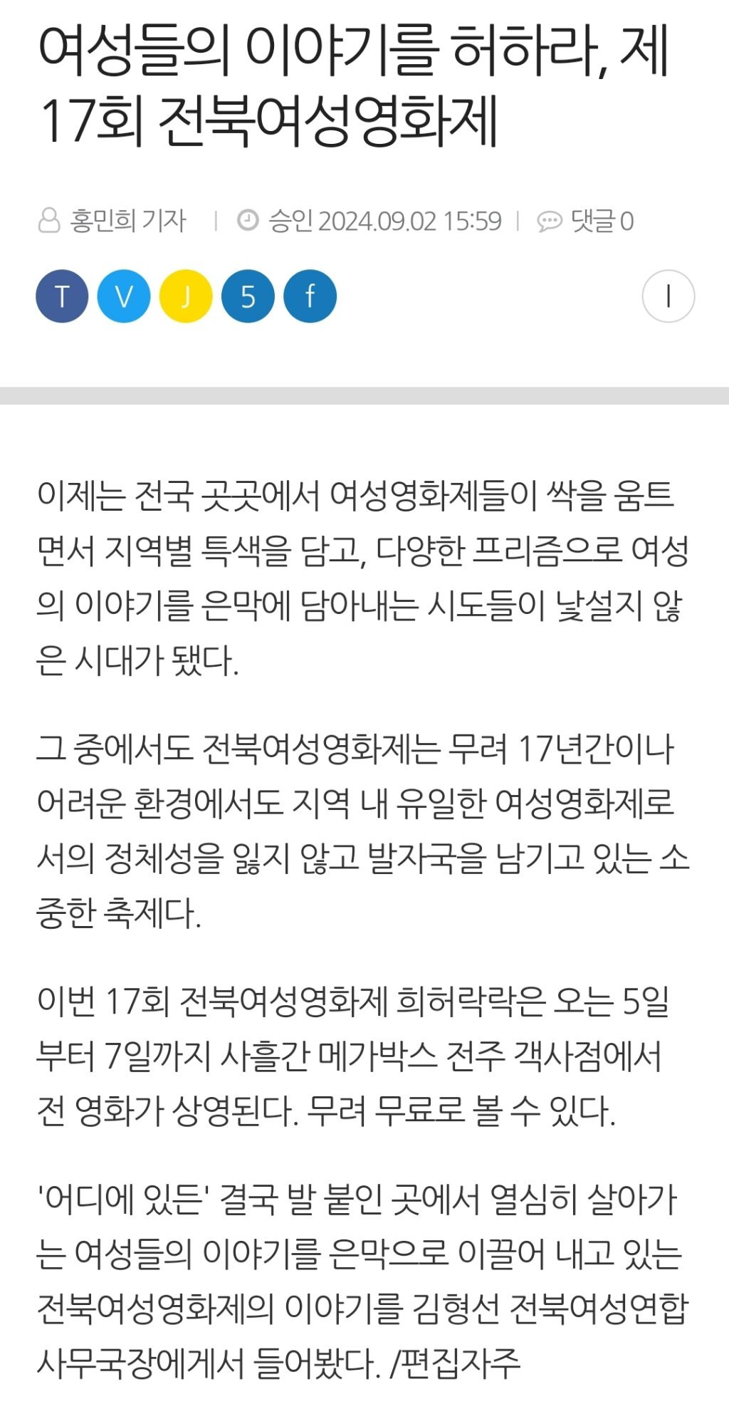 [여시뉴스데스크]여성들의 이야기를 허하라, 제17회 전북여성영화제 작성자천리길|작성시간24.09.02|조회수732 목록 댓글 2 글자크기 작게가 글자크기 크게가 출처: http://www.jeonmin.co.kr/news/articleView.html?idxno=403997여성들의 이야기를 허하라, 제17회 전북여성영화제 - 전민일보이제는 전국 곳곳에서 여성영화제들이 싹을 움트면서 지역별 특색을 담고, 다양한 프리즘으로 여성의 이야기를 은막에 담아내는 시도들이 낯설지 않은 시대가 됐다.그 중에서도 전북여성영화www.jeonmin.co.kr이하 생략전문 출처로 다음검색 현재 게시글 추가 기능 열기 북마크 공유하기 신고 센터로 신고 댓글 댓글 2 댓글쓰기 답글쓰기 댓글 리스트 작성자예뭐 | 작성시간 24.09.02 궁금해서 찾아본 상영일정!! 이미지 확대 작성자손을씻자챡챡 | 작성시간 24.09.02 전북은 못가서 서울 찾아봤는데 서울은 이미 끝났네... 댓글 전체보기