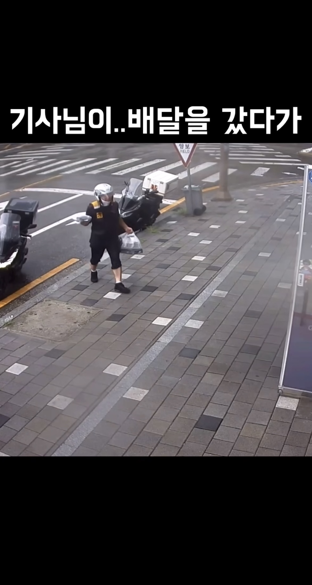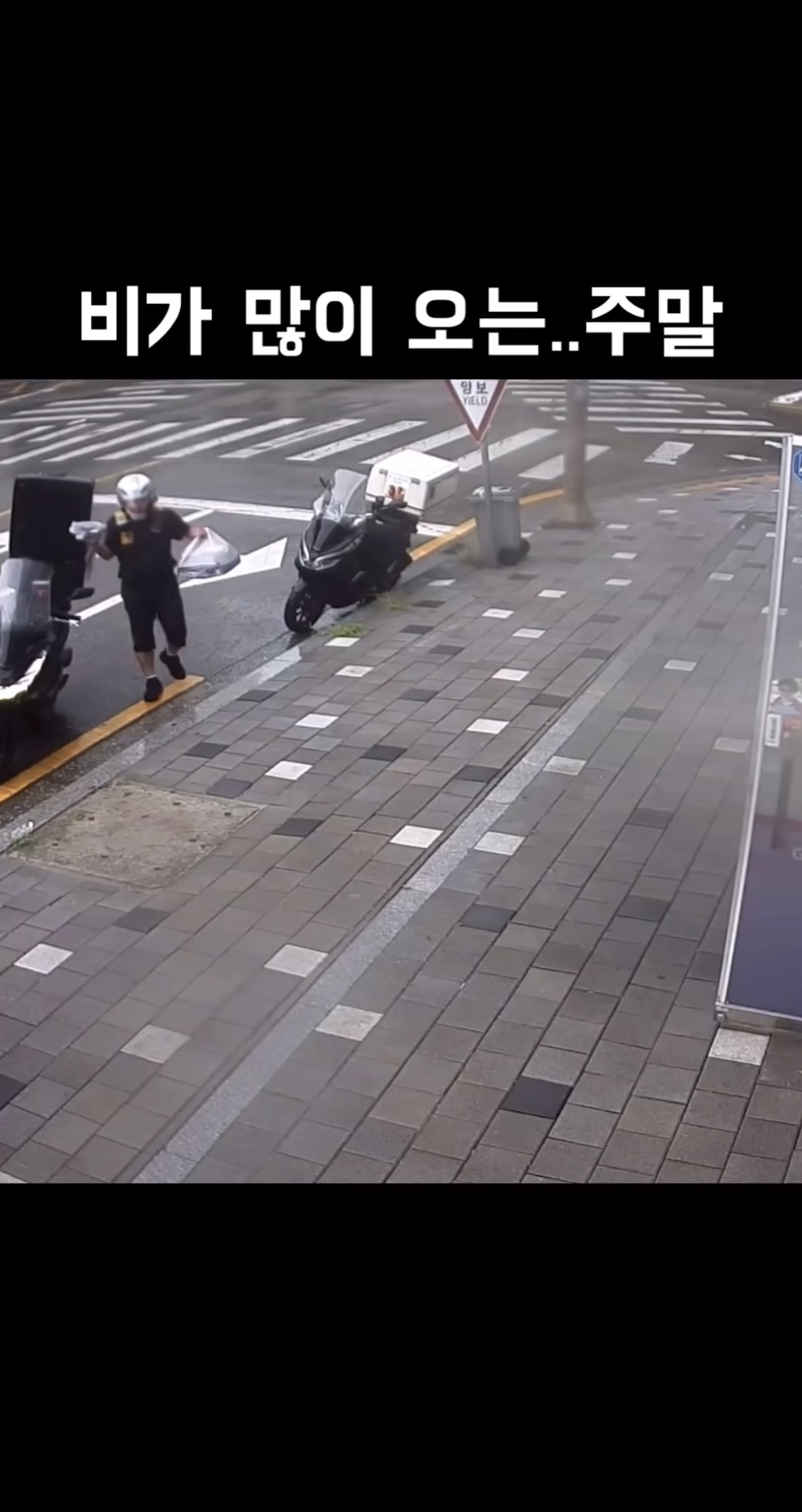 어쩔 수 없이 배달기사가 비 쫄딱 맞으며 다시 피자집으로 피자를 가지고 옴