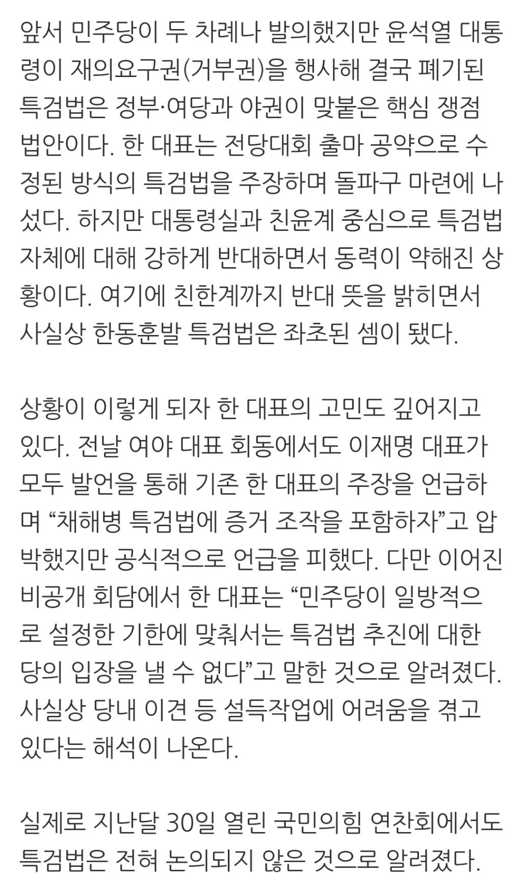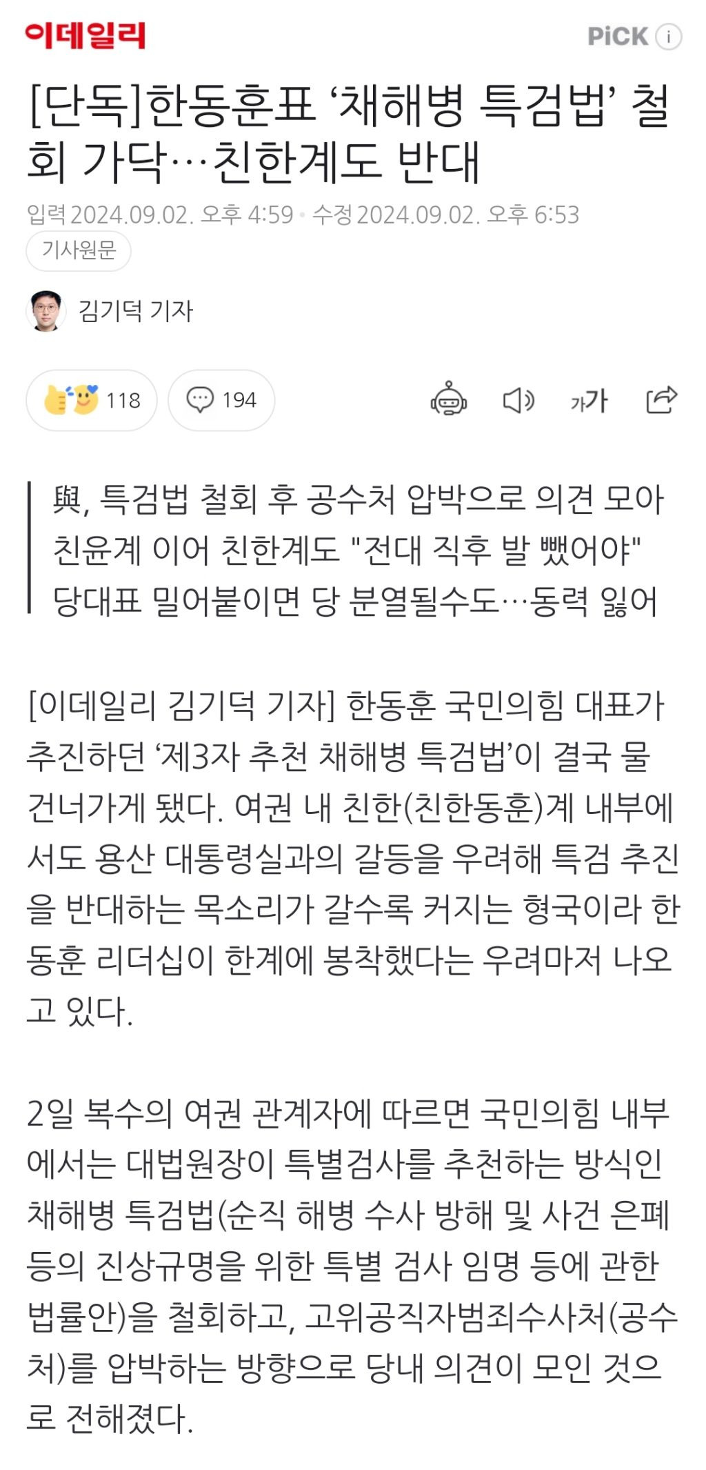 [여시뉴스데스크][단독]한동훈표 ‘채해병 특검법’ 철회 가닥…친한계도 반대 작성자천리길|작성시간24.09.02|조회수483 목록 댓글 4 글자크기 작게가 글자크기 크게가 출처: https://naver.me/FSwwOGnD[단독]한동훈표 ‘채해병 특검법’ 철회 가닥…친한계도 반대한동훈 국민의힘 대표가 추진하던 ‘제3자 추천 채해병 특검법’이 결국 물 건너가게 됐다. 여권 내 친한(친한동훈)계 내부에서도 용산 대통령실과의 갈등을 우려해 특검 추진을 반대하는 목소n.news.naver.com중략이하 생략전문 출처로 다음검색 현재 게시글 추가 기능 열기 북마크 공유하기 신고 센터로 신고 댓글 댓글 4 댓글쓰기 답글쓰기 댓글 리스트 작성자졍청래 | 작성시간 24.09.02 남아있는머리카락도 쥐어 뜯어버릴까 작성자suburbia | 작성시간 24.09.02 정치인으로 처음 걸었던 선거 공약이었잖아 쫄보 맞네 작성자쿵파오리 | 작성시간 24.09.02 븅신 작성자팅딩구리 | 작성시간 24.09.02 당연ㅋㅋ 댓글 전체보기