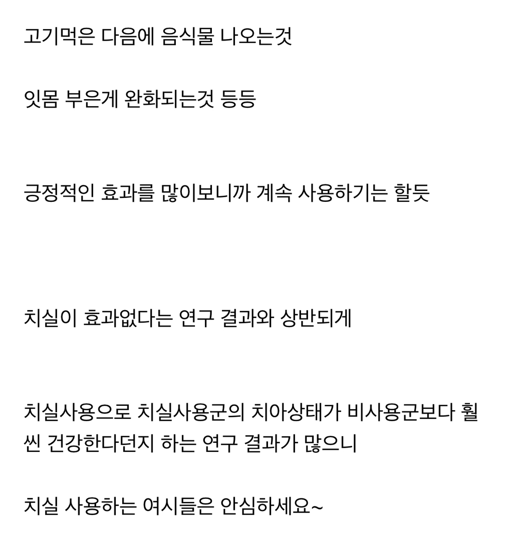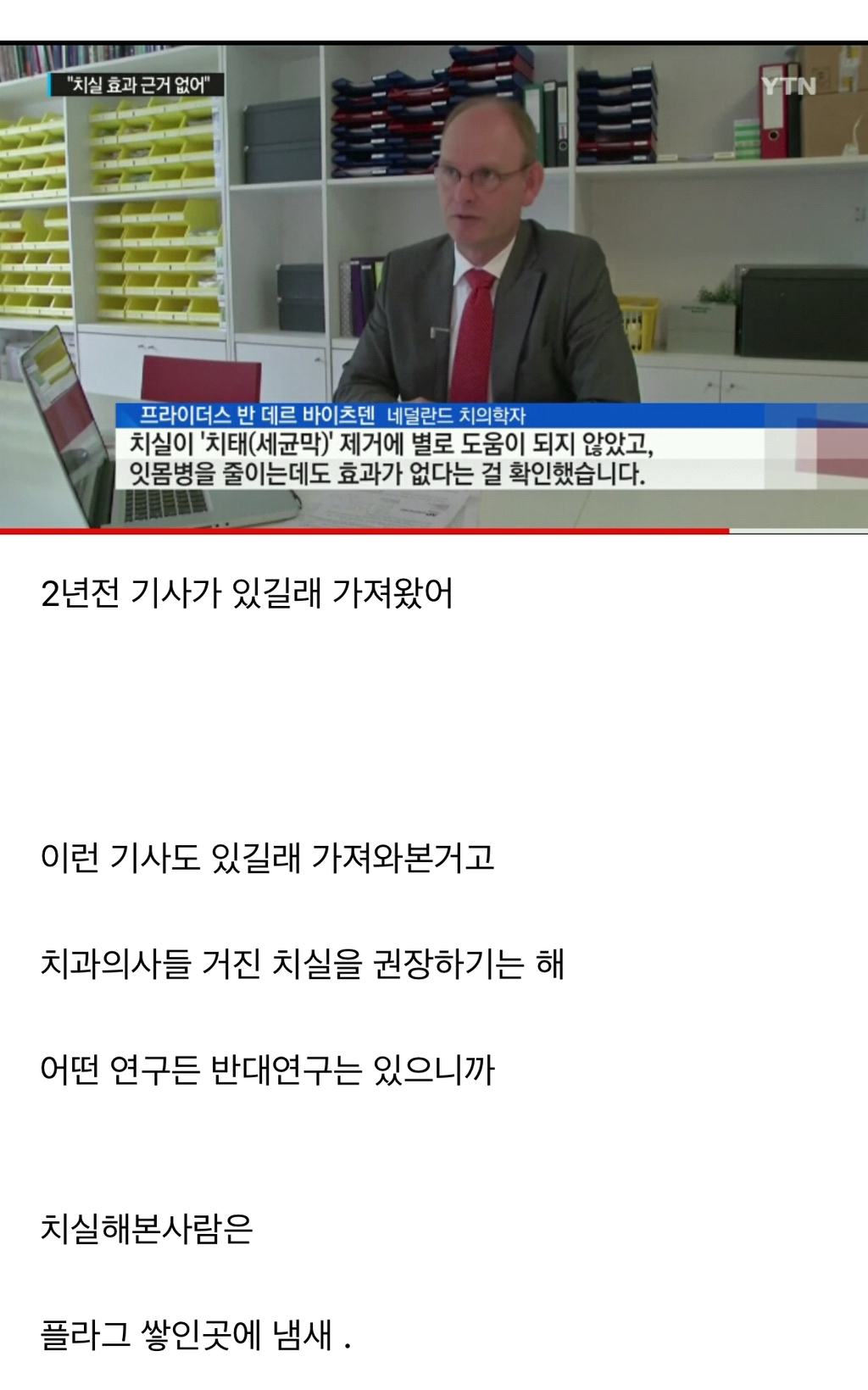 [흥미돋]치실 사용 효과 근거없어 보도...논란 예상 작성자pedo/rapist/abuser|작성시간24.09.03|조회수51,793 목록 댓글 316 글자크기 작게가 글자크기 크게가 출처: 여성시대 pedo/rapist/abuser=======================홍인들 개수작 다음검색 현재 게시글 추가 기능 열기 북마크 공유하기 신고 센터로 신고 댓글 댓글 316 댓글쓰기 답글쓰기 댓글 리스트 작성자화가너무나많은 | 작성시간 24.09.04 이 사이에 낀거 진짜 치실하면 쏙 나오고 좋은디최고임 작성자퇘근하고싶어요 | 작성시간 24.09.04 ‼️여시들 치실 후 양치임 ‼️ 양치 다 하고 치실하면 효과없대 ~~~! 치과의사가 알려줌 답댓글 작성자알라뷰쏘머치 | 작성시간 24.09.13 ㅇㅁㅇ 몰랐어 작성자려미새 | 작성시간 24.09.05 거짓말 마 자주 쓰면 냄새도 안 나는데 작성자옷장 가득찬 거지할머니 | 작성시간 24.09.13 개소리야 댓글 전체보기