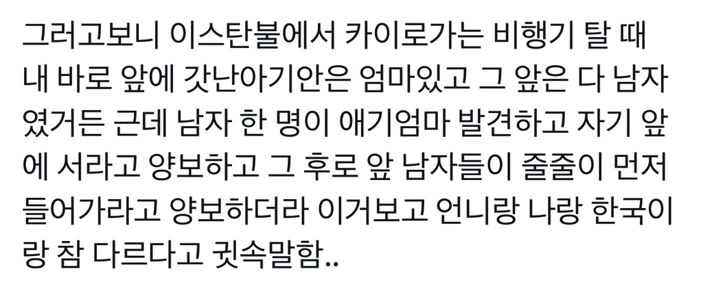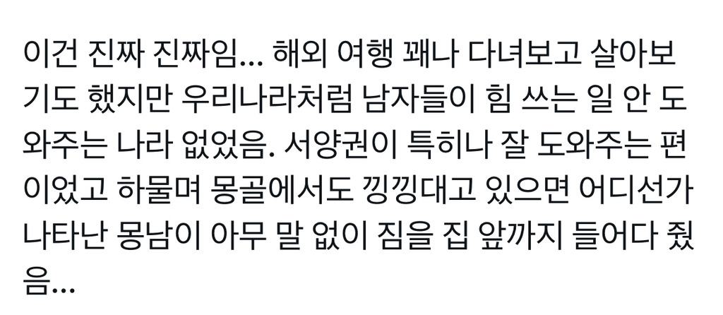 무거운거 때문에 낑낑거렸을때 엄마뻘 아주머니들이나 할머니분들한테 도움 훨씬 더 많이 받은듯 -
