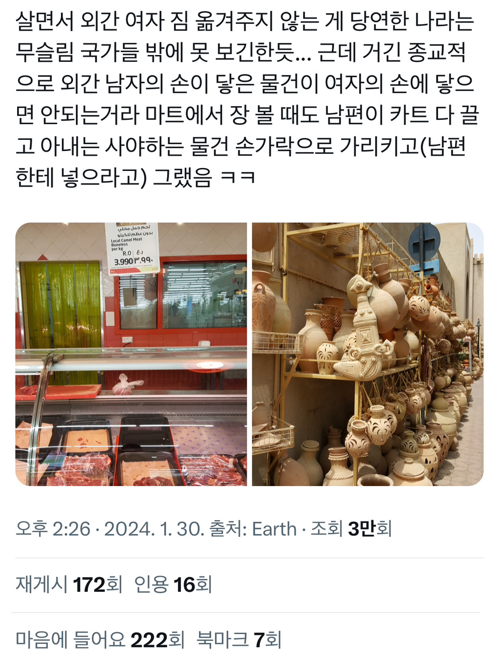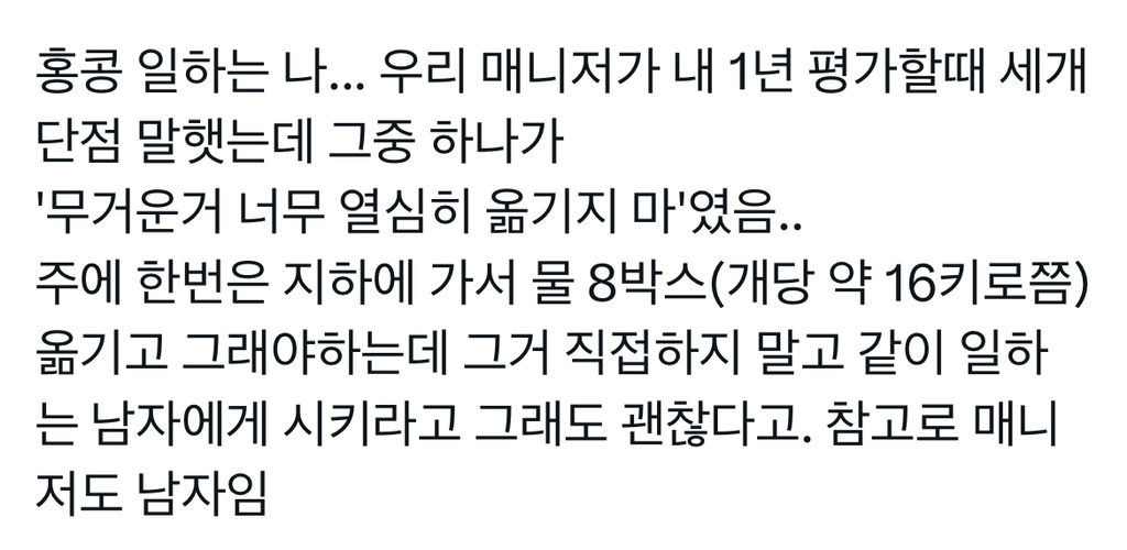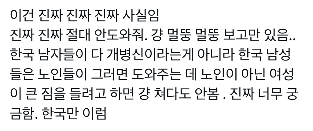 작성자덥부심 작성시간 24.09.03 이거 걍 ㄹㅇ 한남들은 짐들고 가면 이야 거리고 있음. 그나마 도와주거나 엘베 타라고 해주는 사람들은 예의 그잡채 할아버지 몇분과 또래 자식 있는 아빠들임 ㅋ. 이것도 극소수로 한손에 꼽을듯.