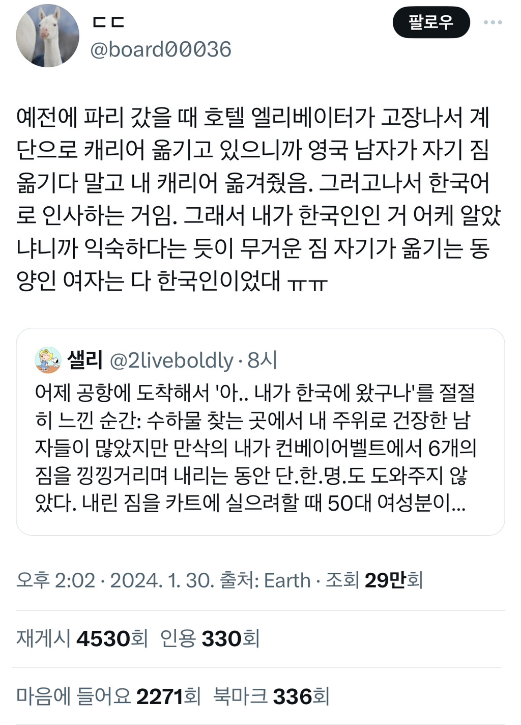 작성자살려조요살려조요 작성시간 24.09.04 나 이번에 시드니 갔을때 엄마가 놀랫던 점 중에 하나가 이거였음 ㅋㅋ 페리타고 가야하는데 하필 거기가 계단이라서 우리는 아빠 나 엄마가 케리어 낑낑 들고 내려갔단말임? 그리고 기다리고 있는데 어떤 중년 백인여자분이 계단인거보고 맙소사 제스쳐 취하더니 옆에있는 백남한테 이거 들라고 시킴 ㅋㅋㅋ 근데 그 백남도 존나 아무말없이 들고 내려감 ㅋㅋㅋㅋ 엄마가 보고 엄청 충격먹었다면서 나한테 얘기해줬는데 그게 충격인것도 충격인 대한민국임...